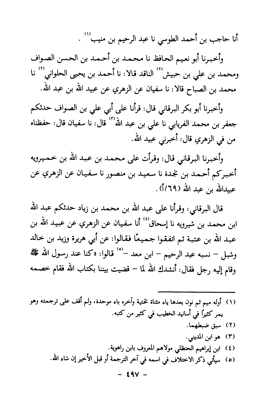 قَالَ الْبَرْقَانِيُّ: وَقَرَأْنَا عَلَى عَبْدِ اللَّهِ بْنُ مُحَمَّدِ بْنِ زِيَادٍ حَدَّثَكُمْ عَبْدُ اللَّهِ بْنُ مُحَمَّدٍ بْنُ شِيرَوَيْهِ نا إِسْحَاقُ4 أنا سُفْيَانُ عَنِ الزُّهْرِيِّ عَنْ عُبَيْدِ اللَّهِ بْنُ عَبْدِ اللَّهِ بْنِ عُتْبَةَ ثُمَّ اتَّفَقُوا جَمِيعًا فَقَالُوا: عَنْ أَبِي هُرَيْرَةَ وَزَيْدِ بْنِ خَالِدٍ وَشِبْلٍ – نَسَبَهُ عَبْدُ الرَّحِيمِ – ابن معد -5 قَالُوا: " كُنَّا عِنْدَ رَسُولِ اللَّهِ صَلَّى اللَّهُ عَلَيْهِ وَسَلَّمَ وَقَامَ إِلَيْهِ رَجُلٌ فَقَالَ: أَنْشُدُكَ اللَّهَ لَمَا – قَضَيْتَ بَيْنَنَا بِكِتَابِ اللَّهِ فقام خصمه