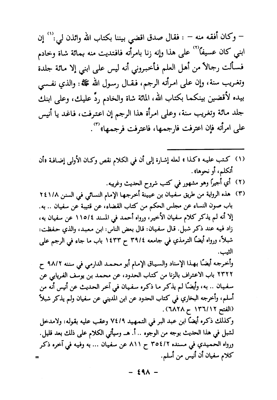 – وَكَانَ أَفْقَهَ مِنْهُ -: فَقَالَ: صَدَقَ اقضي بَيْنَنَا بِكِتَابِ اللَّهِ وَائْذَنْ لِي:1 أَنَّ ابْنِي كَانَ عَسِيفًا2 عَلَى هَذَا وَأَنَّهُ زَنَا بِامْرَأَتِهِ فَافْتَدَيْتُ مِنْهُ بِمِائَةِ شَاةٍ وَخَادِمٍ، فَسَأَلْتُ رِجَالًا مِنْ أَهْلِ الْعِلْمِ فَأَخْبَرُونِي أَنَّهُ لَيْسَ عَلَى ابْنِي إِلا مِائَةُ جَلْدَةٍ وَتَغْرِيبُ سَنَةٍ، وَأَنَّ عَلَى امْرَأَتِهِ الرَّجْمَ، فَقَالَ رَسُولُ الله صَلَّى اللَّهُ عَلَيْهِ وَسَلَّمَ: وَالَّذِي نَفْسِي بِيَدِهِ لأَقْضِيَنَّ بَيْنَكُمَا بِكِتَابِ اللَّهِ، الْمِائَةُ شَاةٍ وَالْخَادِمُ رَدٌّ عَلَيْكَ، وَعَلَى ابْنِكَ جَلْدُ مِائَةٍ وَتَغْرِيبُ سَنَةٍ، وَعَلَى امْرَأَةِ هَذَا الرَّجْمُ إِنِ اعْتَرَفَتْ، فَاغْدُ يَا أُنَيْسُ عَلَى امْرَأَتِهِ فَإِنِ اعترفت فارجمها، فاعترفت فرجمها " 3.