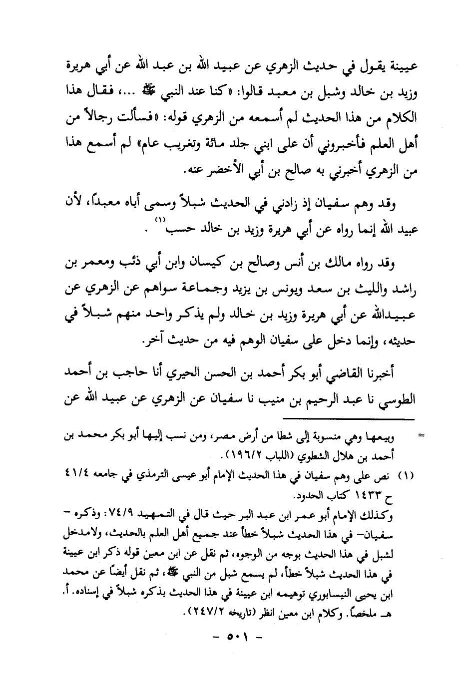 وكذلك الإمام أبو عمر ابن عبد البر حيث قال في التمهيد 9/74: وذكره – سفيان – في هذا الحديث شبلا خطأ عند جميع أهل العلم بالحديث، ولا مدخل لشبل في هذا الحديث بوجه من الوجوه، ثم نقل عن ابن معين قوله ذكر ابن عيينة في هذا الحديث شبلا خطأ، لم يسمع شبل مِنَ النَّبِيِّ صَلَّى اللَّهُ عَلَيْهِ وَسَلَّمَ، ثم نقل أيضا عَنْ مُحَمَّدِ بْنِ يَحْيَى النَّيْسَابُورِيِّ توهيمه ابن عيينة في هذا الحديث بذكره شبلا في إسناده أ. هـ ملخصا. وكلام ابن معين انظر (تاريخ 2/247) .