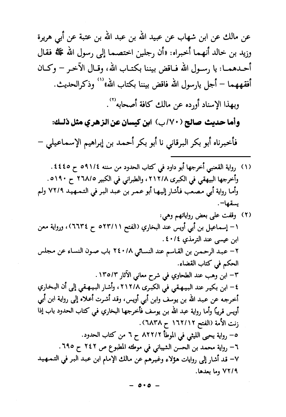 عَنْ مَالِكٍ عَنِ ابْنِ شِهَابٍ عَنْ عُبَيْدِ اللَّهِ بْنِ عَبْدِ اللَّهِ بْنِ عُتْبَةَ عَنْ أَبِي هُرَيْرَةَ وَزَيْدِ بْنِ خَالِدٍ أَنَّهُمَا أَخْبَرَاهُ: " أَنَّ رَجُلَيْنِ اخْتَصَمَا إِلَى رسول الله صَلَّى اللَّهُ عَلَيْهِ وَسَلَّمَ فَقَالَ أَحَدُهُمَا: يَا رَسُولَ اللَّهِ فَاقْضِ بَيْنَنَا بِكِتَابِ اللَّهِ، وَقَالَ الآخَرُ – وَكَانَ أَفْقَهَهُمَا – أَجَلْ يَا رَسُولَ اللَّهِ فَاقْضِ بَيْنَنَا بِكِتَابِ اللَّهِ " 1 وَذَكَرَ الْحَدِيثِ.