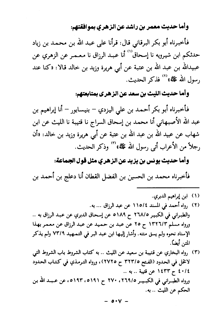 فَأَخْبَرَنَاهُ أَبُو بَكْرٍ أَحْمَدُ بْنُ عَلِيٍّ الْيَزْدِيُّ – بِنَيْسَابُورَ – أنا إِبْرَاهِيمُ بْنُ عَبْدِ اللَّهِ الأَصْبَهَانِيُّ أنا مُحَمَّدُ بْنُ إِسْحَاقَ السَّرَّاجُ نا قُتَيْبَةُ نا اللَّيْثُ عَنِ ابْنِ شِهَابٍ عَنْ عُبَيْدِ اللَّهِ بْنُ عَبْدِ اللَّهِ بْنِ عُتْبَةَ عَنْ أَبِي هُرَيْرَةَ وَزَيْدِ بْنِ خَالِدٍ: " أَنَّ رَجُلًا مِنَ الأَعْرَابِ أَتَى رَسُولَ اللَّهِ صَلَّى اللَّهُ عَلَيْهِ وَسَلَّمَ " 3 وَذَكَرَ الْحَدِيثَ.