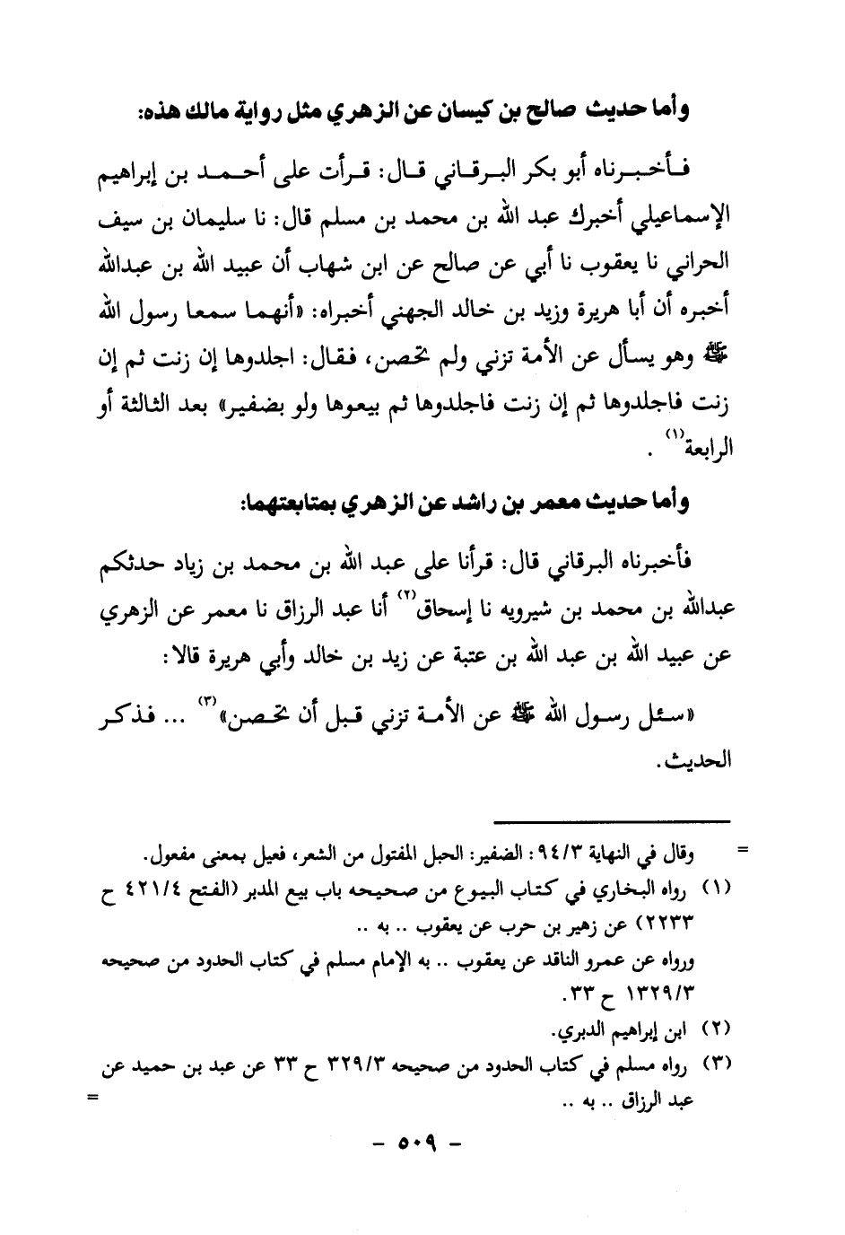 فَأَخْبَرَنَاهُ أَبُو بَكْرٍ الْبَرْقَانِيُّ قَالَ: قَرَأْتُ عَلَى أَحْمَدَ بْنِ إِبْرَاهِيمَ الإِسْمَاعِيلِيِّ أَخْبَرَكَ عَبْدُ اللَّهِ بْنُ مُحَمَّدِ بْنِ مُسْلِمٍ قَالَ: نَا سليمان بن سيف الحراني نا يَعْقُوبُ نا أَبِي عَنْ صَالِحٍ عَنِ ابْنِ شِهَابٍ أَنَّ عُبَيْدِ اللَّهِ بْنِ عَبْدِ اللَّهِ أَخْبَرَهُ أَنَّ أَبَا هُرَيْرَةَ وَزَيْدَ بْنَ خَالِدٍ الْجُهَنِيَّ أَخْبَرَاهُ: " أَنَّهُمَا سَمِعَا رَسُولَ اللَّهِ صَلَّى اللَّهُ عَلَيْهِ وَسَلَّمَ وهو يسأل عَنِ الأَمَةِ تَزْنِي وَلَمْ تُحْصَنْ، فَقَالَ: اجْلِدُوهَا إِنْ زَنَتْ ثُمَّ إِنْ زَنَتْ فَاجْلِدُوهَا ثُمَّ إِنْ زَنَتْ فَاجْلِدُوهَا ثُمَّ بِيعُوهَا وَلَوْ بِضَفِيرٍ " بَعْدَ الثَّالِثَةِ أَوِ الرَّابِعَةِ1.