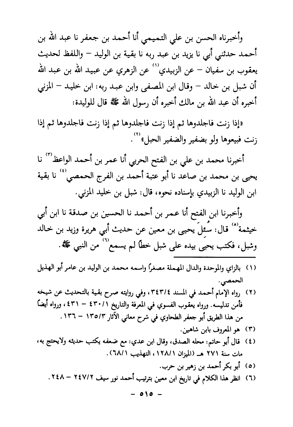 أخبرنا مُحَمَّدُ بْنُ عَلِيِّ بْنِ الْفَتْحِ الْحَرْبِيُّ أَنَا عُمَرُ بْنُ أَحْمَدَ الْوَاعِظُ3 نَا يَحْيَى بْنُ مُحَمَّدِ بْنِ صَاعِدٍ نَا أَبُو عُتْبَةَ أَحْمَدُ بْنُ الْفَرَجِ الْحِمْصِيُّ4 نَا بَقِيَّةُ بْنُ الْوَلِيدِ نَا الزُّبَيْدِيُّ بِإِسْنَادِهِ نَحْوَهُ، قَالَ: شِبْلُ بْنُ خليد المزني.