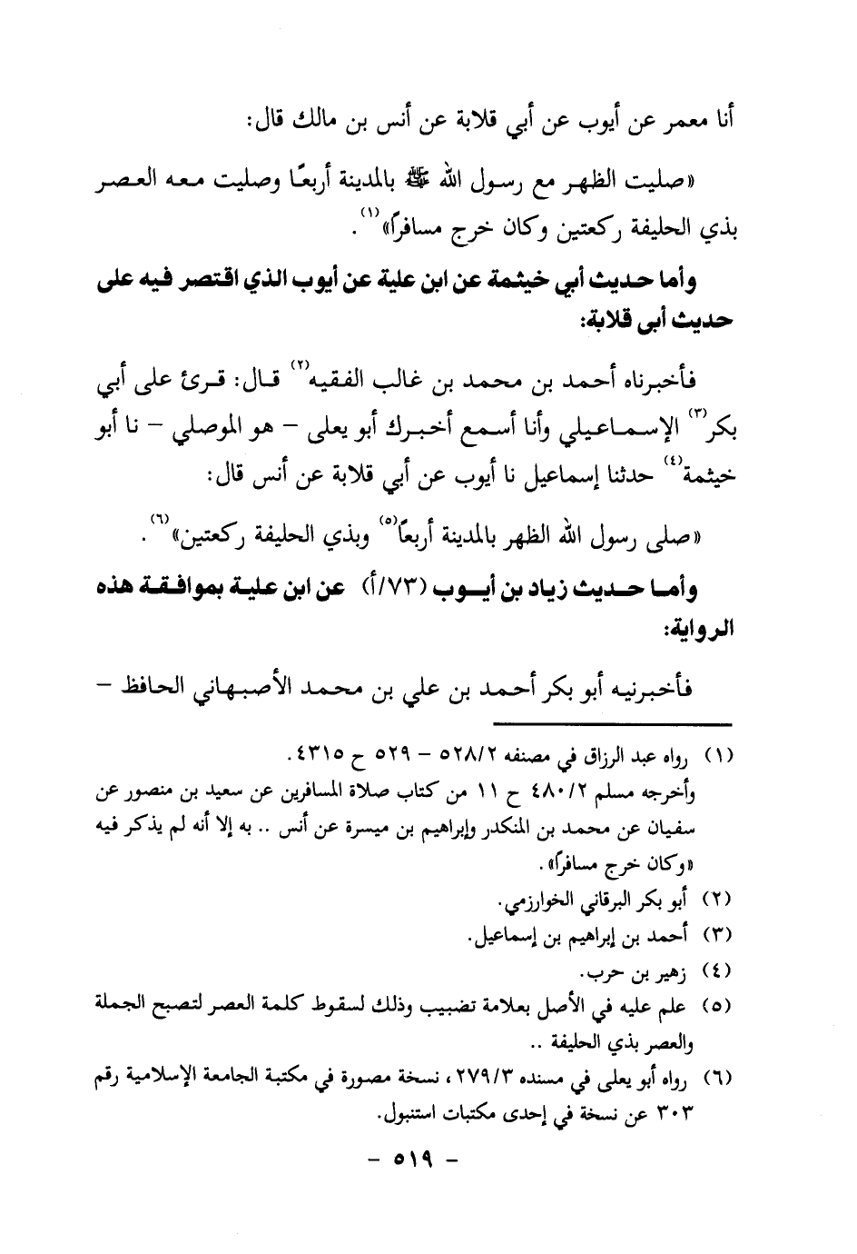 فأخبرناه أَحْمَدُ بْنُ مُحَمَّدِ بْنِ غَالِبٍ الْفَقِيهُ2 قَالَ: قُرِئَ عَلَى أَبِي بَكْرٍ3 الإِسْمَاعِيلِيِّ وَأَنَا أَسْمَعُ أَخْبَرَكَ أَبُو يَعْلَى – هُوَ الْمَوْصِلِيُّ – نا أَبُو خَيْثَمَةَ4 حَدَّثَنَا إِسْمَاعِيلُ نَا أَيُّوبَ عَنْ أَبِي قِلابَةَ عَنْ أَنَسٍ قَالَ: