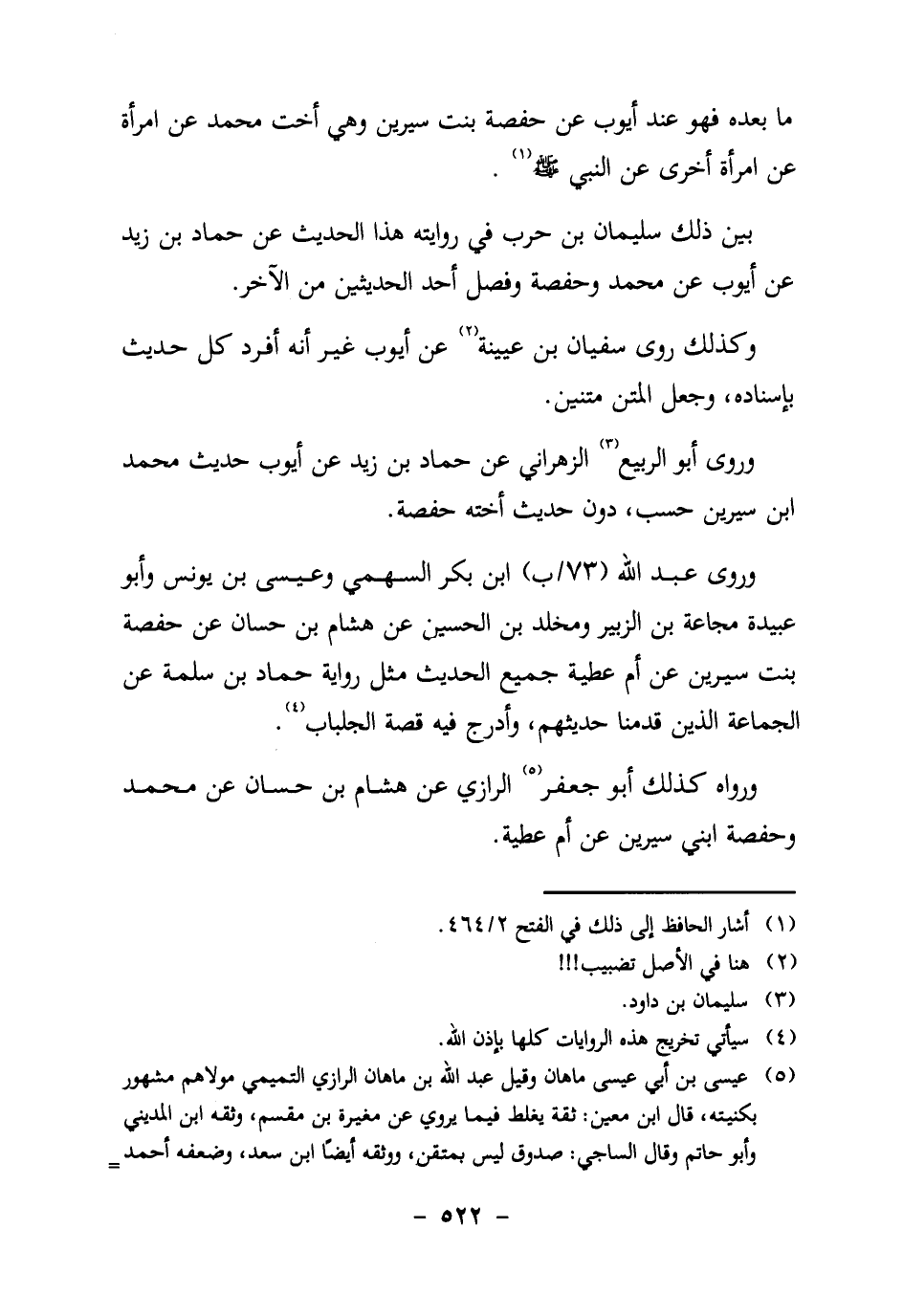 وَرَوَى عَبْدُ الله (73/ب) ابن بَكْرٍ السَّهْمِيُّ وَعِيسَى بْنُ يُونُسَ وَأَبُو عُبَيْدَةَ مَجَاعَةُ بْنُ الزُّبَيْرِ وَمَخْلَدُ بْنُ الْحُسَيْنِ عَنْ هِشَامِ ابن حَسَّانٍ عَنْ حَفْصَةَ بِنْتِ سِيرِينَ عَنْ أُمِّ عَطِيَّةَ جَمِيعَ الْحَدِيثِ مِثْلَ رِوَايَةِ حَمَّادِ بْنِ سَلَمَةَ عَنِ الْجَمَاعَةِ الَّذِينَ قَدَّمْنَا حَدِيثَهُمْ، وَأَدْرَجَ فِيهِ قِصَّةَ الْجِلْبَابِ4.