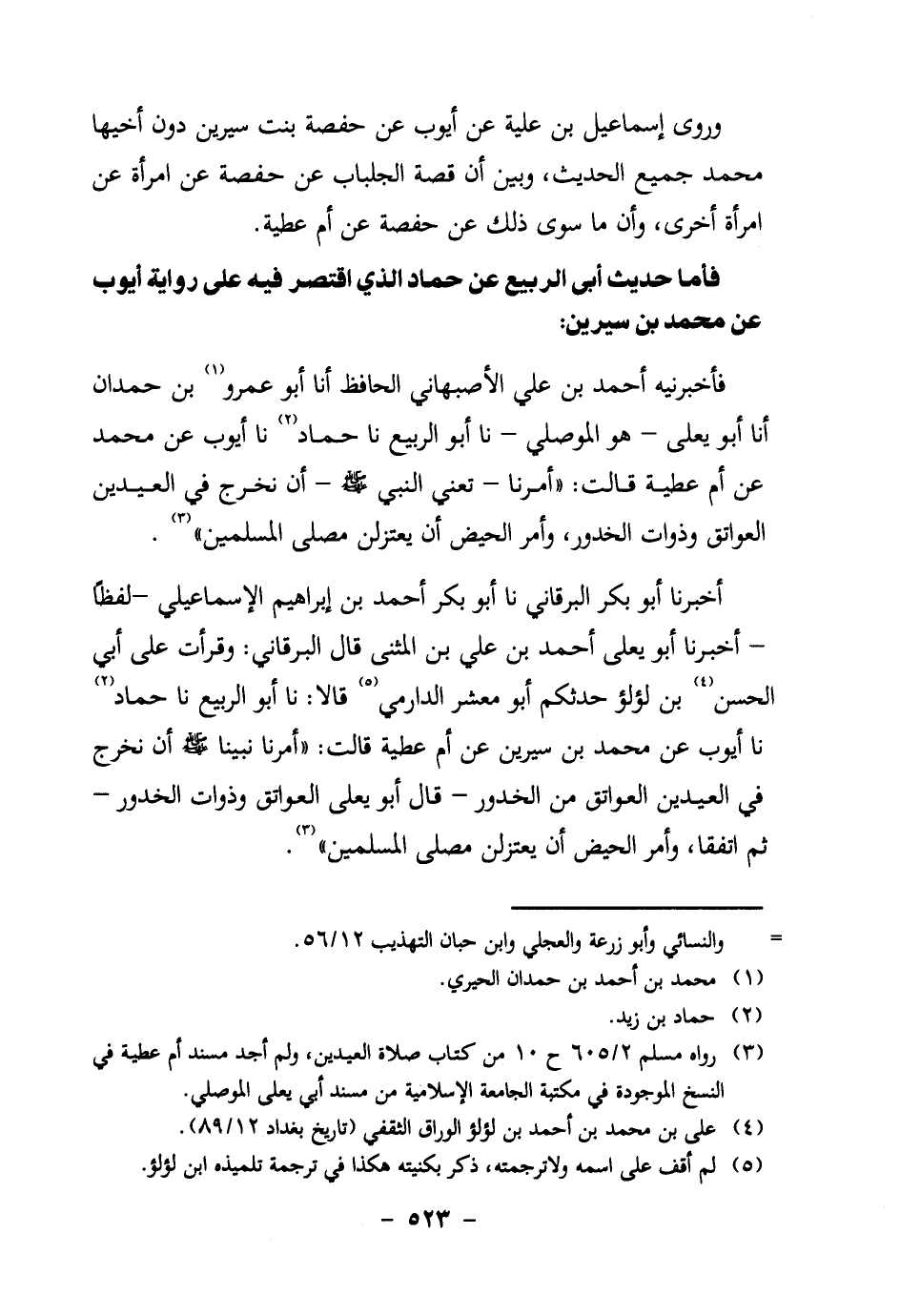 فَأَخْبَرَنِيهِ أَحْمَدُ بْنُ عَلِيٍّ الأَصْبَهَانِيُّ الْحَافِظُ أَنَا أَبُو عَمْرِو1 بْنُ حَمْدَانَ أَنَا أَبُو يَعْلَى – هُوَ الْمَوْصِلِيُّ – نَا أَبُو الرَّبِيعِ نَا حَمَّادٌ2 نَا أَيُّوبُ عَنْ مُحَمَّدٍ عَنْ أُمِّ عَطِيَّةَ قَالَتْ: " أَمَرَنَا – تَعْنِي النَّبِيَّ صَلَّى اللَّهُ عَلَيْهِ وَسَلَّمَ – أَنْ نُخْرِجَ فِي الْعِيدَيْنِ الْعَوَاتِقَ وَذَوَاتِ الْخُدُورِ، وَأَمَرَ الْحُيَّضَ أَنْ يَعْتَزِلْنَ مُصَلَّى الْمُسْلِمِينَ " 3.