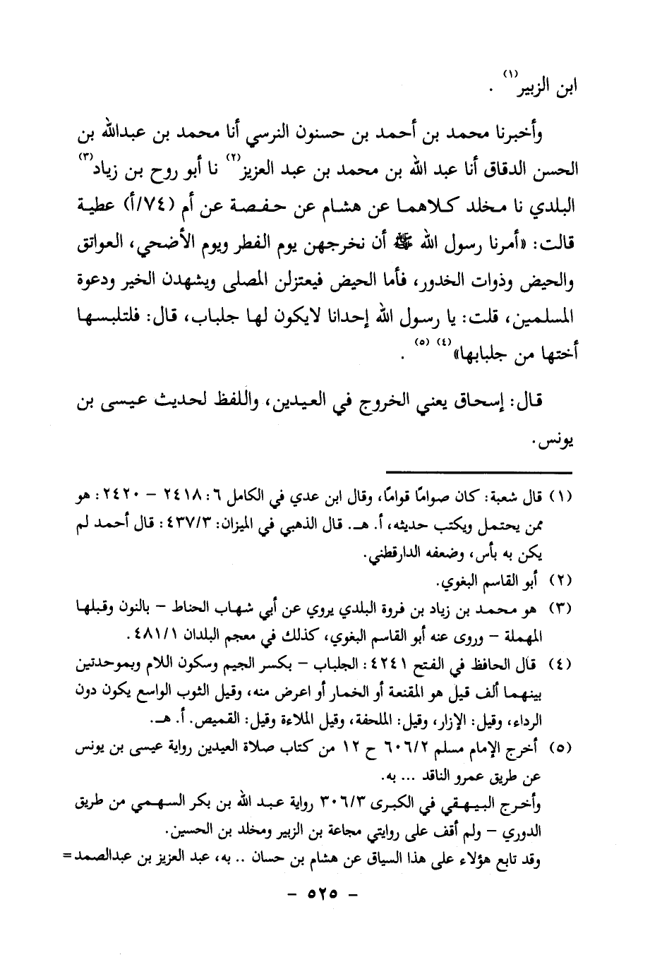 وأخبرنا مُحَمَّدُ بْنُ أَحْمَدَ بْنِ حَسْنُونٍ النَّرْسِيُّ أنا مُحَمَّدُ بْنُ عَبْدِ اللَّهِ بْنِ الْحَسَنِ الدَّقَّاقُ أَنَا عبد الله بن محمد بن عَبْدِ الْعَزِيزِ2 نَا أَبُو رَوْحِ بْنُ زِيَادٍ3 الْبَلَدِيُّ نَا مَخْلَدٌ كِلاهُمَا عَنْ هِشَامٍ عَنْ حَفْصَةَ عن أم (74/أ) عَطِيَّةَ قَالَتْ: " أَمَرَنَا رَسُولُ اللَّهِ صَلَّى اللَّهُ عَلَيْهِ وَسَلَّمَ أَنْ نُخْرِجَهُنَّ يَوْمَ الْفِطْرِ وَيَوْمَ الأَضْحَى، الْعَوَاتِقَ وَالْحُيَّضَ وَذَوَاتِ الْخُدُورِ، فَأَمَّا الْحُيَّضُ فَيَعْتَزِلْنَ الْمُصَلَّى وَيَشْهَدْنَ الْخَيْرَ وَدَعْوَةَ الْمُسْلِمِينَ، قُلْتُ: يَا رَسُولَ اللَّهِ إِحْدَانَا لا يَكُونُ لَهَا جِلْبَابٌ، قَالَ: فَلْتُلْبِسْهَا أُخْتُهَا مِنْ جِلْبَابِهَا " 4 5.
