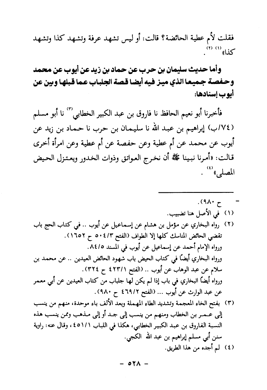 فأخبرنا أَبُو نُعَيْمٍ الْحَافِظُ نَا فَارُوقُ بْنُ عَبْدِ الْكَبِيرِ الْخَطَّابِيُّ3 نَا أبو مسلم (74/ب) إِبْرَاهِيمُ بْنُ عَبْدِ اللَّهِ نَا سُلَيْمَانُ بْنُ حَرْبٍ نا حَمَّادُ بْنِ زَيْدٍ عَنْ أَيُّوبَ عَنْ مُحَمَّدٍ عَنْ أُمِّ عَطِيَّةَ وَعَنْ حَفْصَةَ عَنْ أُمِّ عَطِيَّةَ وَعَنِ امرأة أخرى قَالَتْ: " أَمَرَنَا نَبِيُّنَا صَلَّى اللَّهُ عَلَيْهِ وَسَلَّمَ أَنْ نُخْرِجَ الْعَوَاتِقَ وَذَوَاتِ الْخُدُورِ وَيَعْتَزِلُ الْحُيَّضُ الْمُصَلَّى " 4.