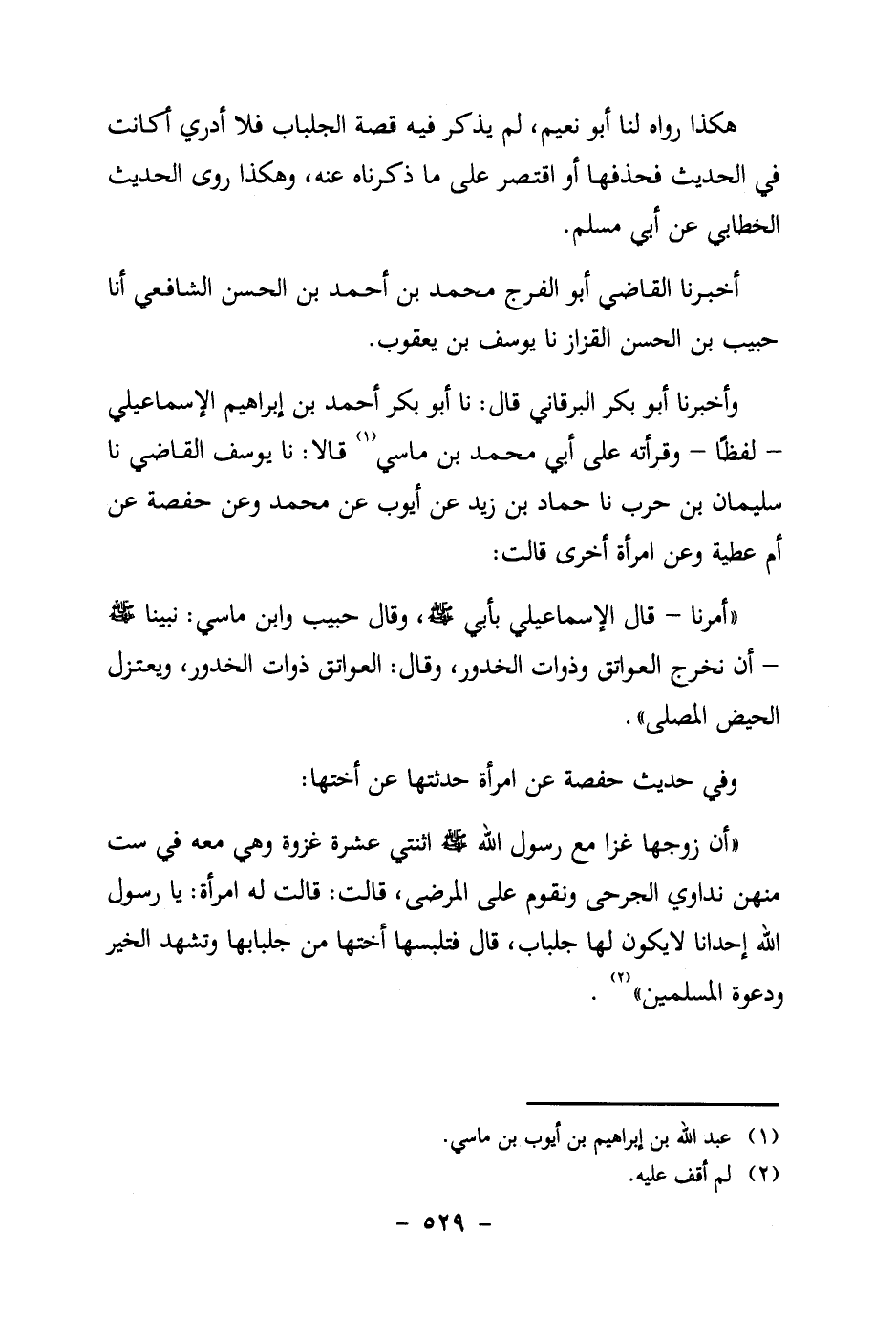 وأخبرنا أَبُو بَكْرٍ الْبَرْقَانِيُّ قَالَ: نَا أَبُو بَكْرٍ أَحْمَدُ بْنُ إِبْرَاهِيمَ الإِسْمَاعِيلِيُّ – لَفْظًا – وَقَرَأْتُهُ عَلَى أَبِي مُحَمَّدِ بْنِ مَاسِيٍّ1 قَالا: نَا يُوسُفُ الْقَاضِي نا سُلَيْمَانُ بْنُ حَرْبٍ نا حَمَّادُ بْنُ زَيْدٍ عن أيوب عن محمد وَعَنْ حَفْصَةَ عَنْ أُمِّ عَطِيَّةَ وَعَنِ امْرَأَةٍ أُخْرَى قَالَتْ: