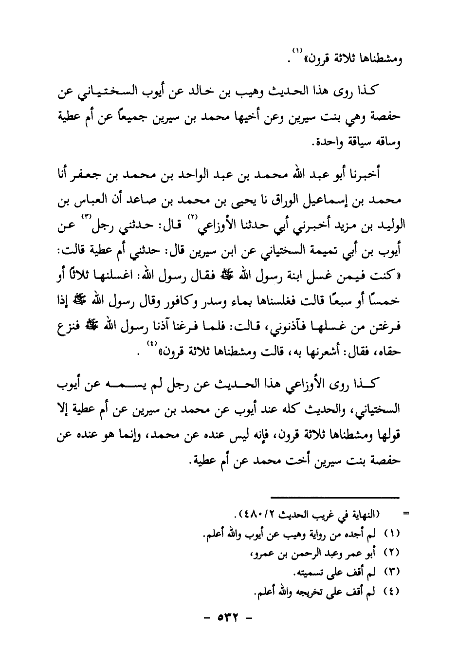 كَذَا رَوَى الأَوْزَاعِيُّ هَذَا الْحَدِيثَ عَنْ رَجُلٍ لَمْ يُسَمِّهِ عَنْ أَيُّوبَ السَّخْتِيَانِيِّ، وَالْحَدِيثُ كُلُّهُ عِنْدَ أَيُّوبَ عَنْ مُحَمَّدِ بْنِ سِيرِينَ عَنْ أُمِّ عَطِيَّةَ إِلا قَوْلَهَا: وَمَشَّطْنَاهَا ثَلاثَةَ قُرُونٍ، فَإِنَّهُ لَيْسَ عِنْدَهُ عَنْ مُحَمَّدٍ، وَإِنَّمَا هُوَ عِنْدَهُ عَنْ حَفْصَةَ بِنْتِ سِيرِينَ أُخْتِ مُحَمَّدٍ عن أم عطية.