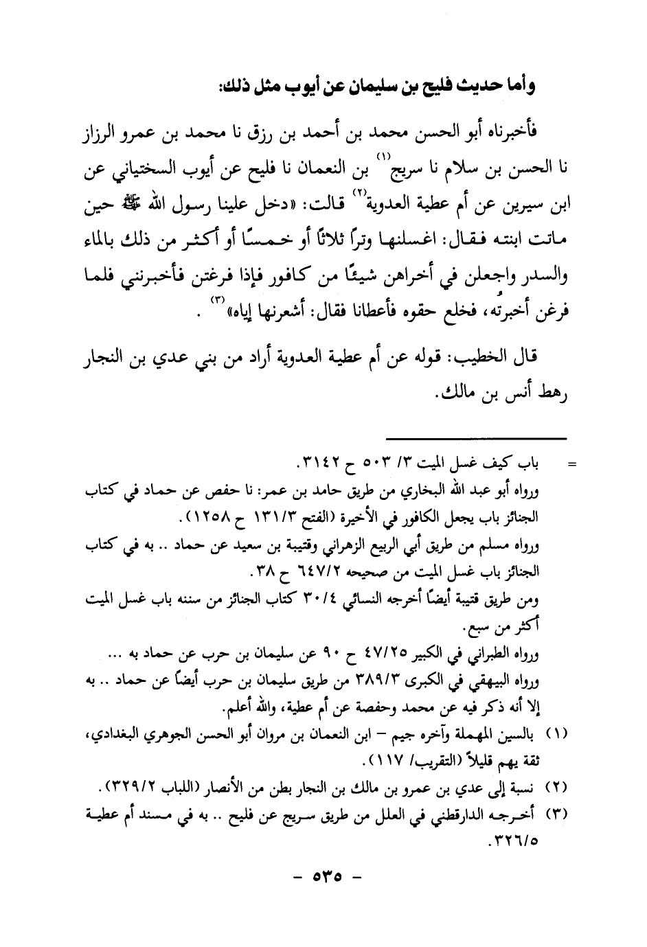فَأَخْبَرَنَاهُ أَبُو الْحَسَنِ مُحَمَّدُ بْنُ أَحْمَدَ بْنِ رِزْقٍ نَا مُحَمَّدُ بْنُ عَمْرٍو الرَّزَّازُ نَا الْحَسَنُ بْنُ سَلامٍ نَا سريج1 بْنُ النُّعْمَانِ نَا فُلَيْحٌ عَنْ أَيُّوبَ السَّخْتِيَانِيِّ عَنِ ابْنِ سِيرِينَ عَنْ أُمِّ عَطِيَّةَ الْعَدَوِيَّةِ2 قَالَتْ: " دَخَلَ عَلَيْنَا رَسُولُ اللَّهِ صَلَّى اللَّهُ عَلَيْهِ وَسَلَّمَ حِينَ مَاتَتِ ابْنَتُهُ فَقَالَ: اغْسِلْنَهَا وِتْرًا ثَلاثًا أَوْ خَمْسًا أَوْ أَكْثَرَ مِنْ ذَلِكَ بِالْمَاءِ وَالسِّدْرِ وَاجْعَلْنَ فِي أُخْرَاهُنَّ شَيْئًا مِنْ كَافُورٍ فَإِذَا فرغتن فأخبرنني فلما فرغن أخبرته، فَخَلَعَ حَقْوَهُ فَأَعْطَانَا فَقَالَ: أَشْعِرْنَهَا إِيَّاهُ " 3.