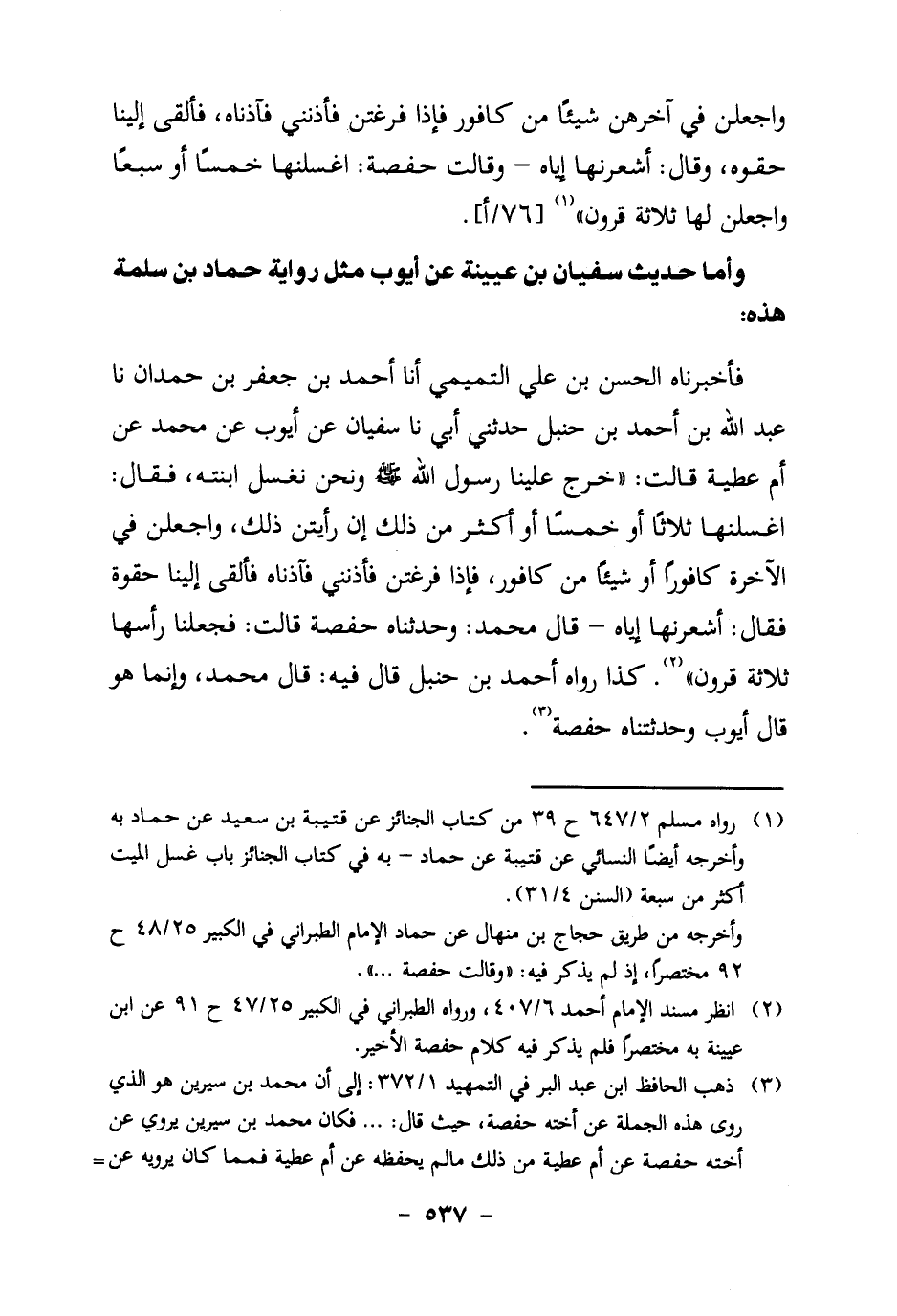 فأخبرناه الْحَسَنُ بْنُ عَلِيٍّ التَّمِيمِيُّ أنا أَحْمَدُ بْنُ جَعْفَرِ بْنِ حَمْدَانَ نا عَبْدُ اللَّهِ بْنُ أَحْمَدَ بْنِ حَنْبَلٍ حَدَّثَنِي أَبِي نا سُفْيَانُ عَنْ أَيُّوبَ عَنْ مُحَمَّدٍ عَنْ أُمِّ عَطِيَّةَ قَالَتْ: " خَرَجَ عَلَيْنَا رَسُولُ اللَّهِ صَلَّى اللَّهُ عَلَيْهِ وَسَلَّمَ وَنَحْنُ نُغَسِّلُ ابْنَتَهُ، فَقَالَ: اغْسِلْنَهَا ثَلاثًا أَوْ خَمْسًا أَوْ أَكْثَرَ مِنْ ذَلِكَ إِنْ رَأَيْتُنَّ ذَلِكَ، وَاجْعَلْنَ فِي الآخِرَةِ كَافُورًا أَوْ شَيْئًا مِنْ كَافُورٍ، فَإِذَا فَرَغْتُنَّ فَآذِنَّنِي فَآذَنَّاهُ فَأَلْقَى إِلَيْنَا حَقْوَهُ فَقَالَ: أَشْعِرْنَهَا إِيَّاهُ – قال محمد: وحدثناه حَفْصَةُ قَالَتْ: فَجَعَلْنَا رَأْسَهَا ثَلاثَةَ قرون " 2. كذا رواه أحمد بن حنبل قال فيه: قال مُحَمَّدٌ، وَإِنَّمَا هُوَ قَالَ أَيُّوبُ وحدثتناه حفصة3.