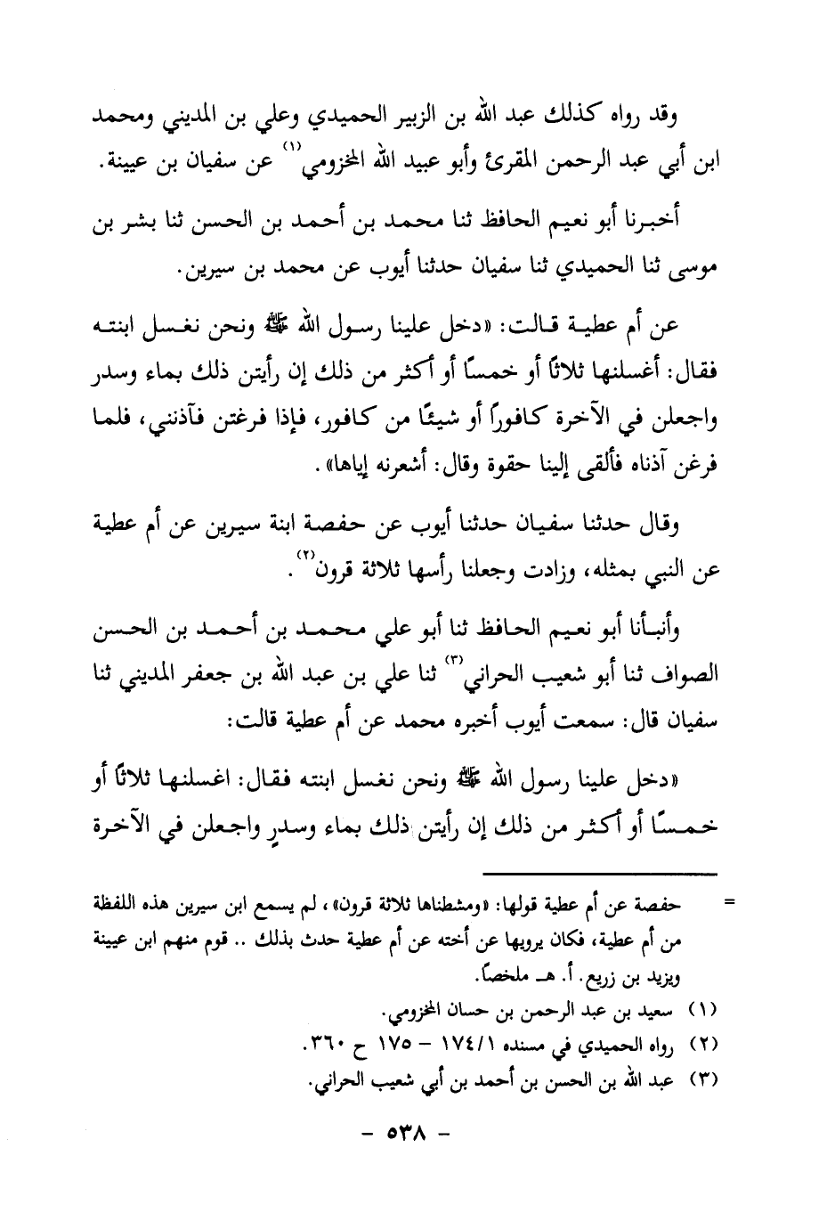 وأنبأنا أبو نعيم الحافظ ثنا أَبُو عَلِيٍّ مُحَمَّدُ بْنُ أَحْمَدَ بن الحسن الصواف ثنا أبو شعيب الحراني3 ثنا عَلِيُّ بْنُ عَبْدِ اللَّهِ بْنِ جعفر المديني ثنا سُفْيَانُ قَالَ: سَمِعْتُ أَيُّوبَ أَخْبَرَهُ مُحَمَّدٍ عَنْ أُمِّ عَطِيَّةَ قَالَتْ: