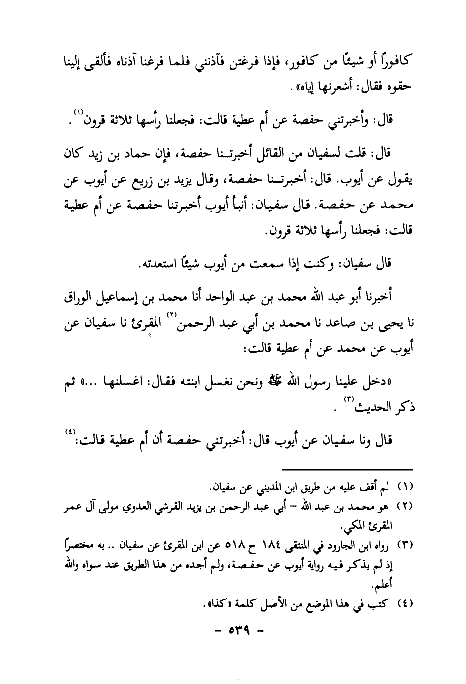 قَالَ: قُلْتُ لِسُفْيَانَ مَنِ الْقَائِلُ أَخْبَرَتْنَا حَفْصَةُ، فَإِنَّ حَمَّادَ بْنَ زَيْدٍ كَانَ يَقُولُ عَنْ أَيُّوبَ. قَالَ: أخبرتنا حفصة، وقال يزيد ابن زُرَيْعٍ عَنْ أَيُّوبَ عَنْ مُحَمَّدٍ عن حفصة. قال سفيان: أنبأ أَيُّوبُ أَخْبَرَتْنَا حَفْصَةُ عَنْ أُمِّ عَطِيَّةَ قَالَتْ: فَجَعَلْنَا رَأْسَهَا ثَلاثَةَ قُرُونٍ.