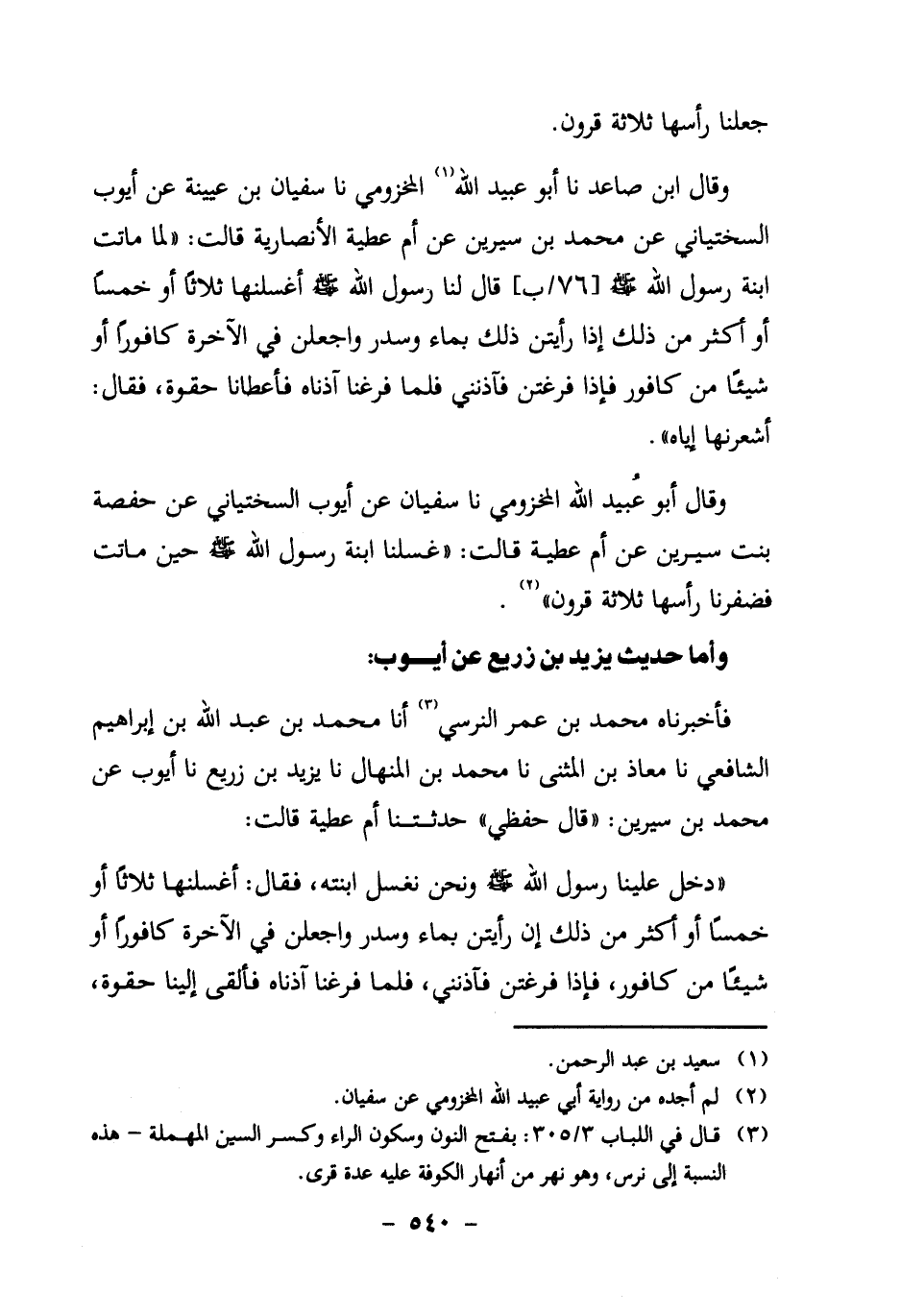 وَقَالَ أَبُو عُبَيْدِ اللَّهِ الْمَخْزُومِيُّ نَا سُفْيَانُ عَنْ أَيُّوبَ السَّخْتِيَانِيِّ عَنْ حَفْصَةَ بِنْتِ سِيرِينَ عَنْ أُمِّ عَطِيَّةَ قَالَتْ: " غَسَّلْنَا ابْنَةَ رسول الله صَلَّى اللَّهُ عَلَيْهِ وَسَلَّمَ حِينَ مَاتَتْ فَضَفَّرْنَا رَأْسَهَا ثَلاثَةَ قُرُونٍ " 2.