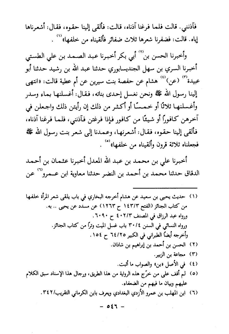 وَأَخْبَرَنَا الْحَسَنُ بْنُ2 أَبِي بَكْرٍ أَخْبَرَنَا عَبْدُ الصَّمَدِ بْنُ عَلِيٍّ الطَّسْتِيُّ أَخْبَرَنَا السَّرِيُّ بْنُ سَهْلٍ الْجُنْدِيسَابُورِيُّ حدثنا عبد الله ابن رُشَيْدٍ حَدَّثَنَا أَبُو عُبَيْدَةَ3 (عَنْ) 4 هِشَامٍ عَنْ حَفْصَةَ بِنْتِ سِيرِينَ عَنْ أُمِّ عَطِيَّةَ قَالَتِ: " انْتَهَى إِلَيْنَا رَسُولُ اللَّهِ صَلَّى اللَّهُ عَلَيْهِ وَسَلَّمَ وَنَحْنُ نُغَسِّلُ إِحْدَى بَنَاتِهِ، فَقَالَ: اغْسِلْنَهَا بِمَاءٍ وَسِدْرٍ وَاغْسِلْنَهَا ثَلاثًا أَوْ خَمْسًا أَوْ أَكْثَرَ مِنْ ذَلِكَ إِنْ رَأَيْتُنَّ ذلك واجعلن في آخرهن كَافُورًا أَوْ شَيْئًا مِنْ كَافُورٍ فَإِذَا فَرَغْتُنَّ فَآذِنَّنِي، فَلَمَّا فَرَغْنَا آذَنَّاهُ، فَأَلْقَى إِلَيْنَا حَقْوَهُ، فَقَالَ: أَشْعِرْنَهَا، وَعَمِدْنَا إِلَى شَعْرِ بِنْتِ رسول الله صَلَّى اللَّهُ عَلَيْهِ وَسَلَّمَ فَجَعَلْنَاهُ ثَلاثَةَ قُرُونٍ وَأَلْقَيْنَاهُ مِنْ خَلْفِهَا " 5.