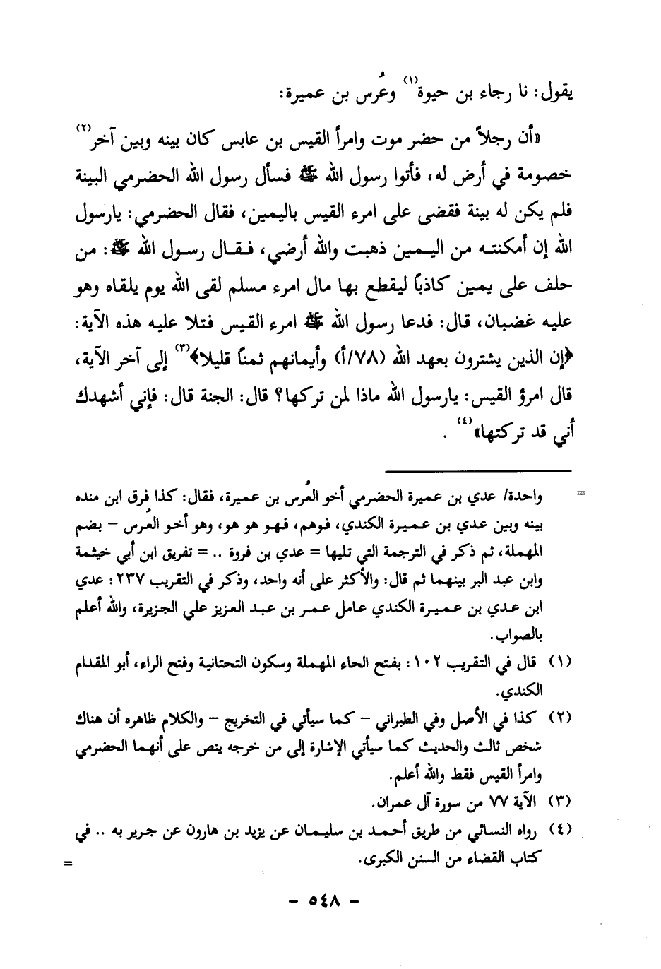 " أَنَّ رَجُلًا مِنْ حَضْرَمَوْتَ وَامْرَأَ الْقَيْسِ بْنَ عَابِسٍ كَانَ بَيْنَهُ وَبَيْنَ آخَرَ2 خُصُومَةٍ فِي أَرْضٍ لَهُ، فَأَتَوْا رَسُولَ الله صَلَّى اللَّهُ عَلَيْهِ وَسَلَّمَ فسأل رسول الله الحضرمي البينة فلم يكن له بينة فقضى على امرء الْقَيْسِ بِالْيَمِينِ، فَقَالَ الْحَضْرَمِيُّ: يَا رسول الله إن أَمْكَنْتَهُ مِنَ الْيَمِينِ ذَهَبَتْ وَاللَّهِ أَرْضِي، فَقَالَ رَسُولُ اللَّهِ صَلَّى اللَّهُ عَلَيْهِ وَسَلَّمَ: مَنْ حَلَفَ عَلَى يَمِينٍ كَاذِبًا لِيَقْطَعَ بِهَا مال امرء لَقِيَ اللَّهَ يَوْمَ يَلْقَاهُ وَهُوَ عَلَيْهِ غَضْبَانُ، قَالَ: فَدَعَا رَسُولُ الله صَلَّى اللَّهُ عَلَيْهِ وَسَلَّمَ امرء الْقَيْسِ فَتَلا عَلَيْهِ هَذِهِ الآيَةَ: {إِنَّ الَّذِينَ يَشْتَرُونَ بِعَهْدِ اللَّهِ (78/أ) وَأَيْمَانِهِمْ ثَمَناً قَلِيلاً} 3 إلى آخر الآية، قال امرء الْقَيْسِ: يَا رَسُولَ اللَّهِ مَاذَا لِمَنْ تَرَكَهَا؟ قَالَ: الْجَنَّةُ قَالَ: فَإِنِّي أُشْهِدُكَ أَنِّي قَدْ تَرَكْتُهَا " 4.