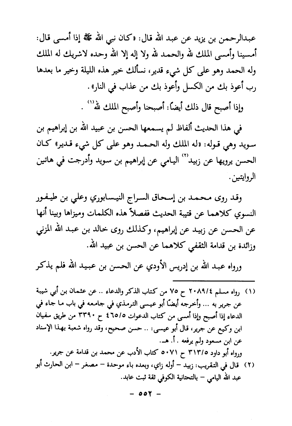 عَبْدِ الرَّحْمَنِ بْنِ يَزِيدَ عَنْ عبد الله قال: " كان نَبِيُّ اللَّهِ صَلَّى اللَّهُ عَلَيْهِ وَسَلَّمَ إِذَا أَمْسَى قَالَ: أَمْسَيْنَا وَأَمْسَى الْمُلْكُ لِلَّهِ وَالْحَمْدُ لِلَّهِ وَلا إِلَهَ إِلا اللَّهُ وَحْدَهُ لا شَرِيكَ لَهُ، لَهُ الْمُلْكُ وَلَهُ الْحَمْدُ وَهُوَ عَلَى كُلِّ شيء قدير، نسألك خَيْرَ هَذِهِ اللَّيْلَةِ وَخَيْرَ مَا بَعْدَهَا رَبِّ أَعُوذُ بِكَ مِنَ الْكَسَلِ وَأَعُوذُ بِكَ مِنْ عَذَابِ في النَّارِ ".
