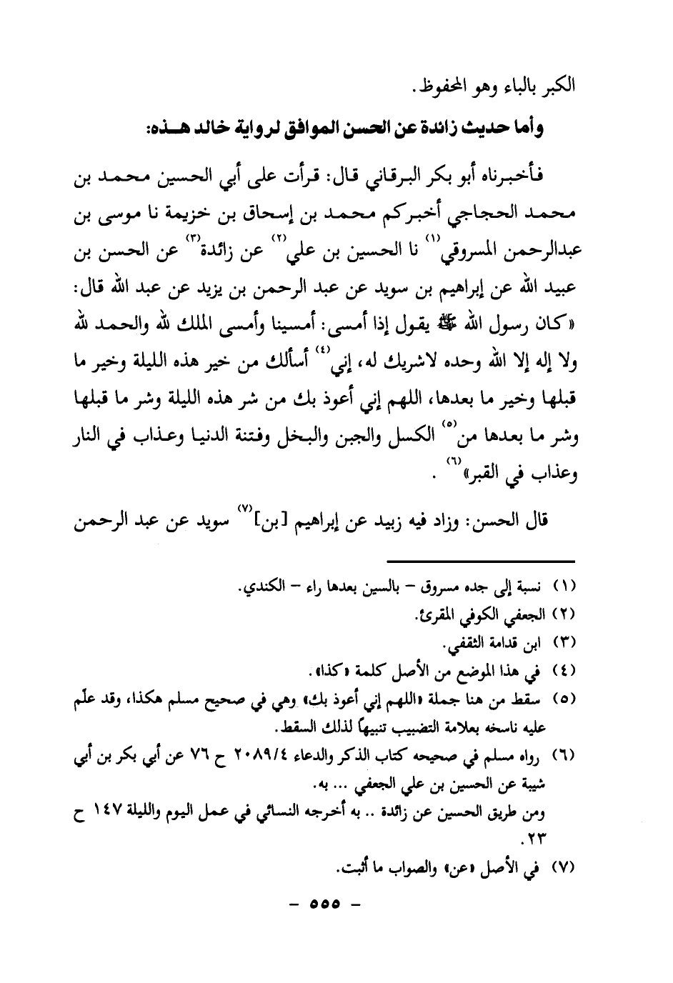 فَأَخْبَرَنَاهُ أَبُو بَكْرٍ الْبَرْقَانِيُّ قَالَ: قَرَأْتُ عَلَى أَبِي الْحُسَيْنِ مُحَمَّدِ بْنِ مُحَمَّدٍ الْحَجَّاجِيِّ أَخْبَرَكُمْ مُحَمَّدُ بْنُ إِسْحَاقَ بْنِ خُزَيْمَةَ نا مُوسَى بْنُ عَبْدِ الرَّحْمَنِ الْمَسْرُوقِيُّ1 نَا الْحُسَيْنُ بْنُ عَلِيٍّ2 عَنْ زَائِدَةَ3 عَنِ الْحَسَنِ بْنِ عُبَيْدِ اللَّهِ عَنْ إِبْرَاهِيمَ بْنِ سُوَيْدٍ عَنْ عَبْدِ الرَّحْمَنِ بْنِ يَزِيدَ عَنْ عَبْدِ اللَّهِ قَالَ: