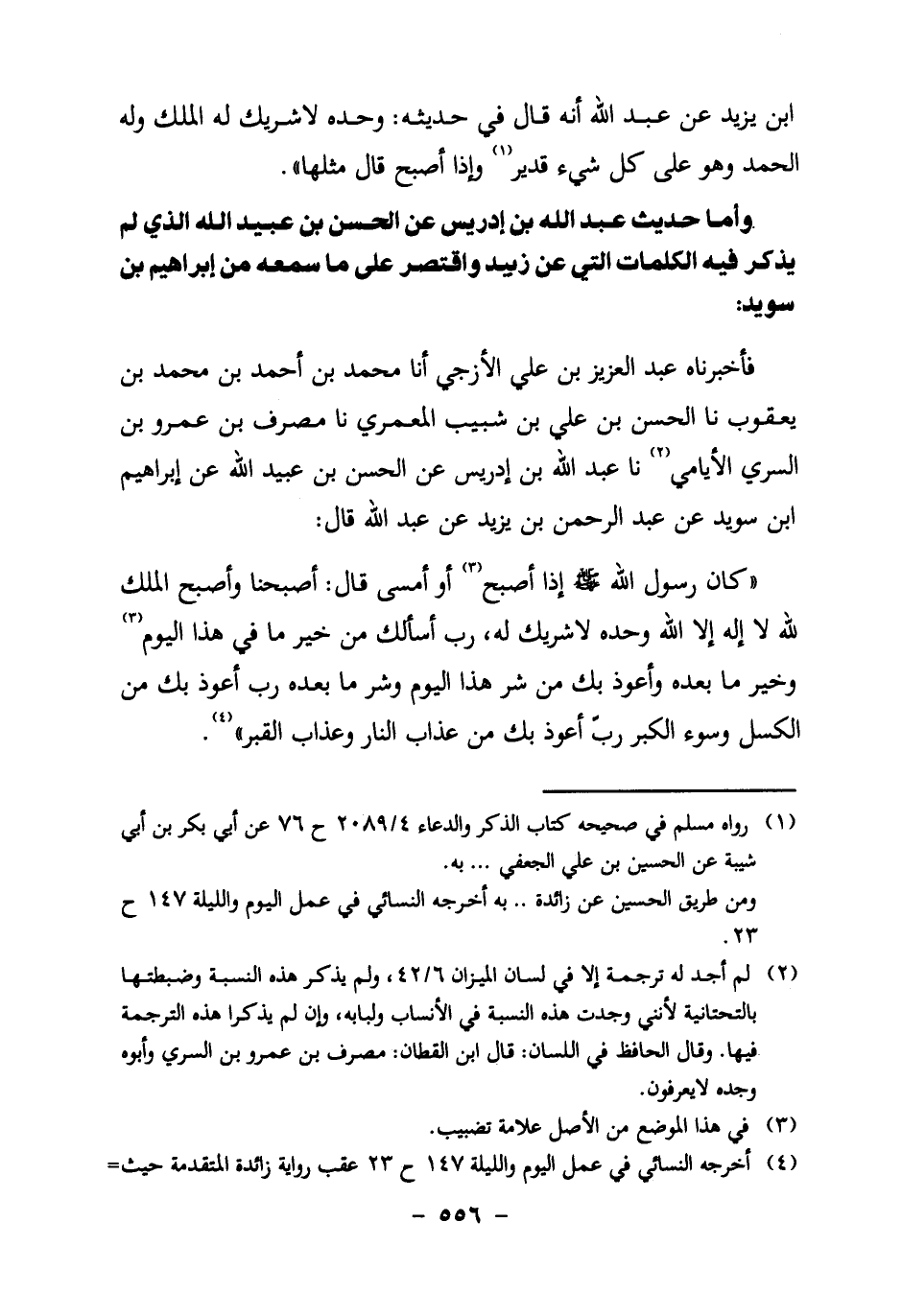 ابن يَزِيدَ عَنْ عَبْدِ اللَّهِ أَنَّهُ قَالَ فِي حَدِيثِهِ: وَحْدَهُ لا شريك لَهُ الْمُلْكُ وَلَهُ الْحَمْدُ وَهُوَ عَلَى كُلِّ شَيْءٍ قَدِيرٌ 1 وَإِذَا أَصْبَحَ قَالَ مِثْلَهَا ".