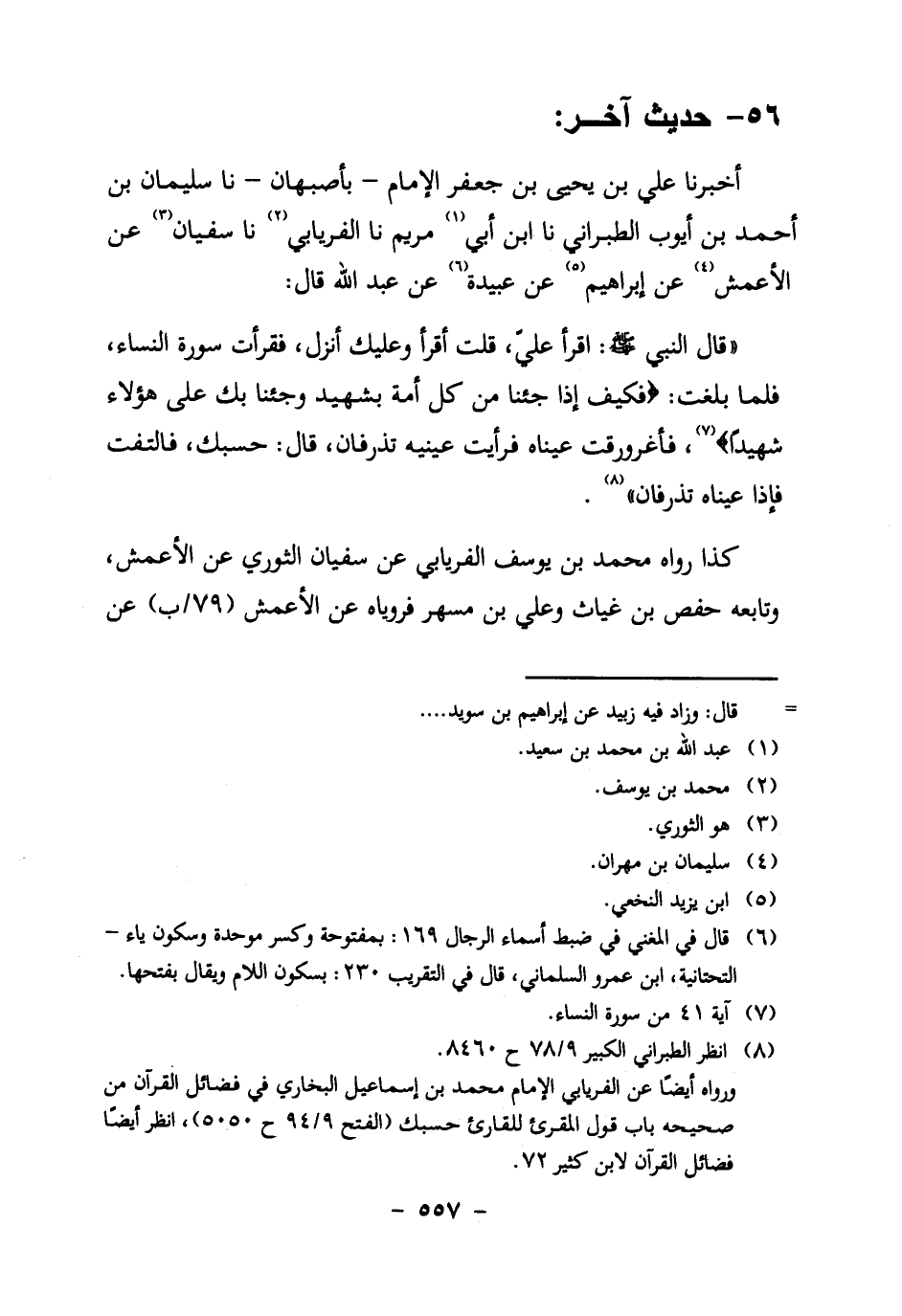 " قَالَ النَّبِيُّ صَلَّى اللَّهُ عَلَيْهِ وَسَلَّمَ: اقْرَأْ عَلَيَّ، قُلْتُ: أَقْرَأُ وَعَلَيْكَ أُنْزِلَ، فَقَرَأْتُ سُورَةَ النِّسَاءِ، فَلَمَّا بَلَغْتُ: {فَكَيْفَ إِذَا جِئْنَا مِنْ كُلِّ أُمَّةٍ بِشَهِيدٍ وَجِئْنَا بِكَ عَلَى هَؤُلاءِ شَهِيداً} 7، فأغرورقت عَيْنَاهُ فَرَأَيْتُ عَيْنَيْهِ تَذْرِفَانِ، قَالَ: حَسْبُكَ، فَالْتَفَتُّ فَإِذَا عَيْنَاهُ تَذْرِفَانِ" 8.