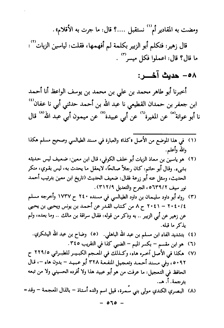 قَالَ زُهَيْرٌ: فَتَكَلَّمَ أَبُو الزُّبَيْرِ بِكَلِمَةٍ لَمْ أَفْهَمْهَا، فَقُلْتُ: لِيَاسِينَ الزَّيَّاتِ2: مَا قَالَ؟ قَالَ: اعْمَلُوا فكل ميسر3.