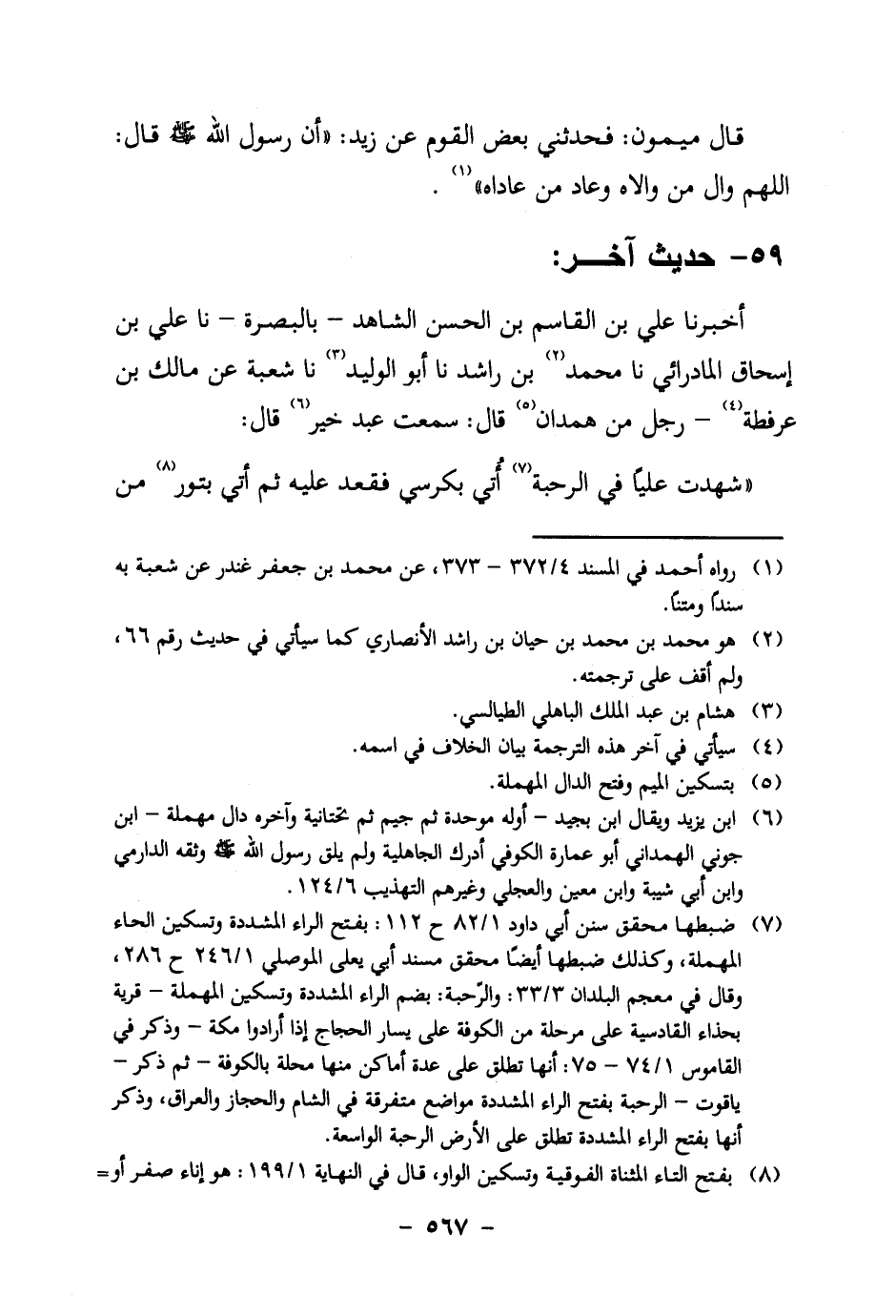 7. ضبطها محقق سنن أبي داود 1/82 ح 112: بفتح الراء المشددة وتسكين الحاء المهملة، وكذلك ضبطها أيضا محقق مسند أبي يعلى الموصلي 1/246 ح 286، وقال في معجم البلدان 3/33: والرحبة: بضم الراء المشددة وتسكين المهملة – قرية بحذاء القادسية على مرحلة من الكوفة على يسار الحجاج إذا أرادوا مكة – وذكر في القاموس 1/74- 75: أنها تطلق على عدة أماكن منها محلة بالكوفة – ثم ذكر – ياقوت – الرحبة بفتح الراء المشددة مواضع متفرقة في الشام والحجاز والعراق، وذكر أنها بفتح الراء المشددة تطلق على الأرض الرحبة الواسعة.
