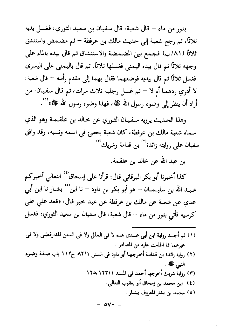 كَذَا أَخْبَرَنَا أَبُو بَكْرٍ الْبَرْقَانِيُّ قَالَ: قَرَأْنَا عَلَى إِسْحَاقَ4 النِّعَالِيِّ أَخْبَرَكُمْ عَبْدُ اللَّهِ بْنُ سُلَيْمَانَ – هُوَ أبو بكر بن دَاوُدَ – نا ابْنُ5 بَشَّارٍ نا ابْنُ أَبِي عَدِيٍّ عَنْ شُعْبَةَ عَنْ مَالِكِ بْنِ عُرْفُطَةَ عَنْ عَبْدِ خَيْرٍ قَالَ: " قَعَدَ عَلِيٌّ عَلَى كُرْسِيِّهِ فَأُتِيَ بِتَوْرٍ مِنْ مَاءٍ – قَالَ شُعْبَةُ: قَالَ سُفْيَانُ بن سعيد الثوري: فغسل