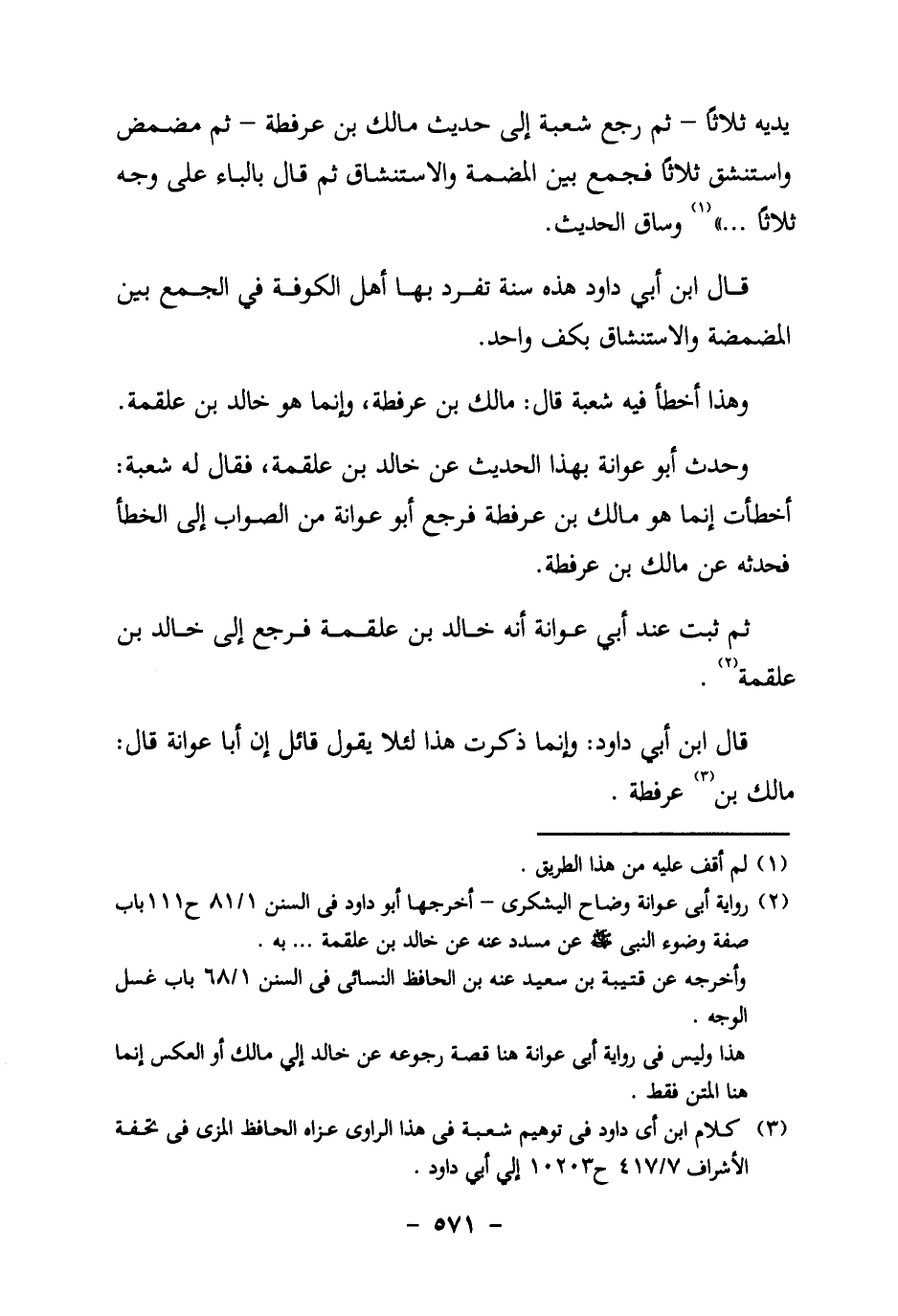 أما دعوى أن تغيير الاسم إلى (مالك بن عرفطة) من باب التصحيف فإنه غير مفهوم، لأنه لا شبه بينه وبين خالد بن علقمة (في الكتابة ولا في النطق، ثم أين موضع التصحيف؟ وشعبة لم ينقل هذا الاسم من كتاب، إنما الشيخ شيخه رآه بنفسه وسمع منه بأذنه ... ، فالظاهر عندي أنهما روايتان وأن أبو عوانة سمع من كل واحد منهما. أ. هـ ملخصا.