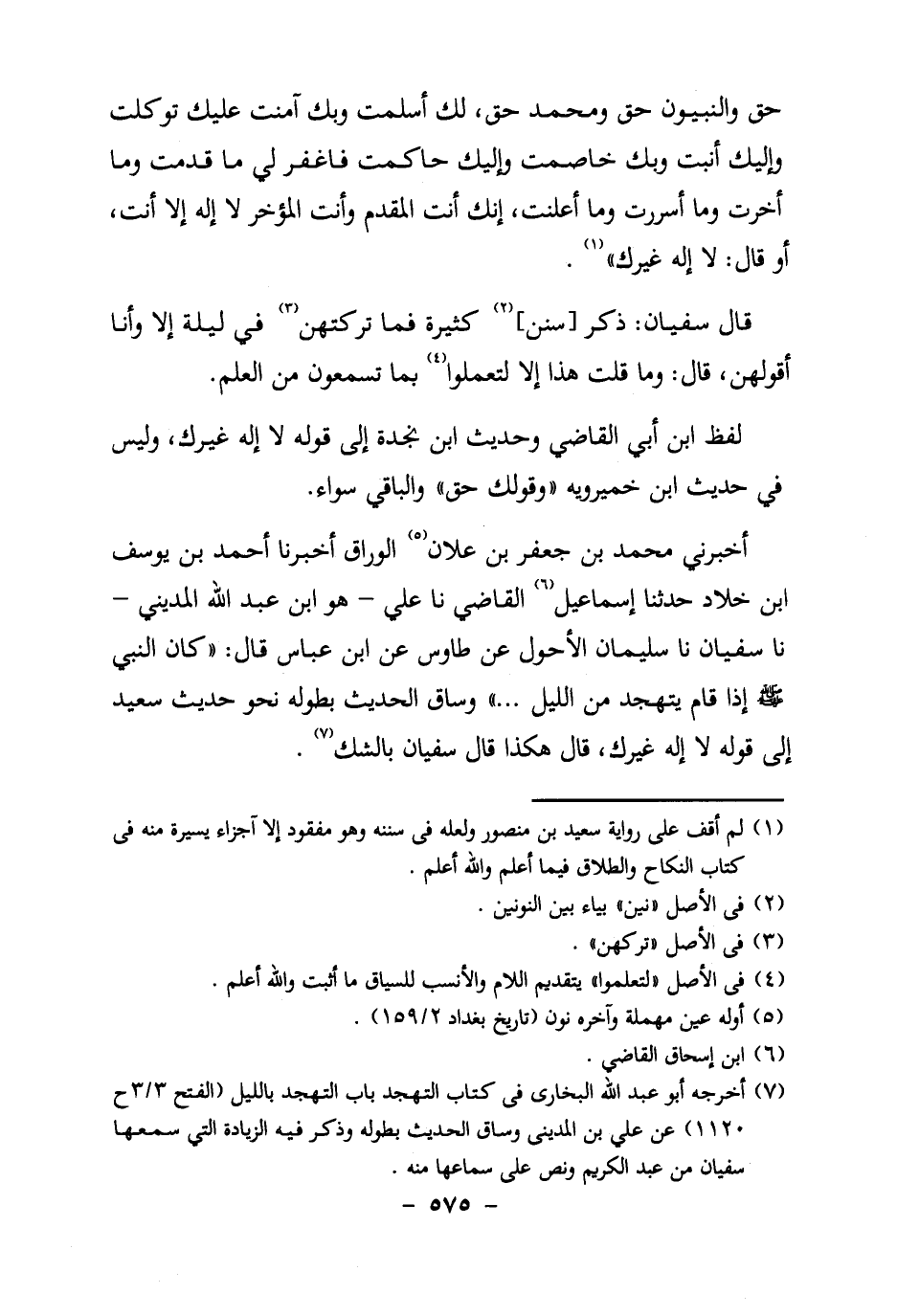 أَخْبَرَنِي مُحَمَّدُ بْنُ جَعْفَرِ بْنِ عِلانَ5 الْوَرَّاقُ أَخْبَرَنَا أَحْمَدُ بْنُ يُوسُفَ بْنِ خَلادٍ حَدَّثَنَا إِسْمَاعِيلُ6 الْقَاضِي نَا عَلِيٌّ – هُوَ ابْنُ عَبْدِ اللَّهِ الْمَدِينِيُّ – نَا سُفْيَانُ نَا سُلَيْمَانُ الأَحْوَلُ عَنْ طَاوُسٍ عَنِ ابْنِ عَبَّاسٍ قَالَ: " كَانَ النَّبِيُّ صَلَّى اللَّهُ عَلَيْهِ وَسَلَّمَ إِذَا قَامَ يَتَهَجَّدُ مِنَ اللَّيْلِ ... " وَسَاقَ الْحَدِيثَ بِطُولِهِ نَحْوَ حَدِيثِ سَعِيدٍ إِلَى قَوْلِهِ لا إله غيرك، قال هكذا قال سفيان بالشك7.
