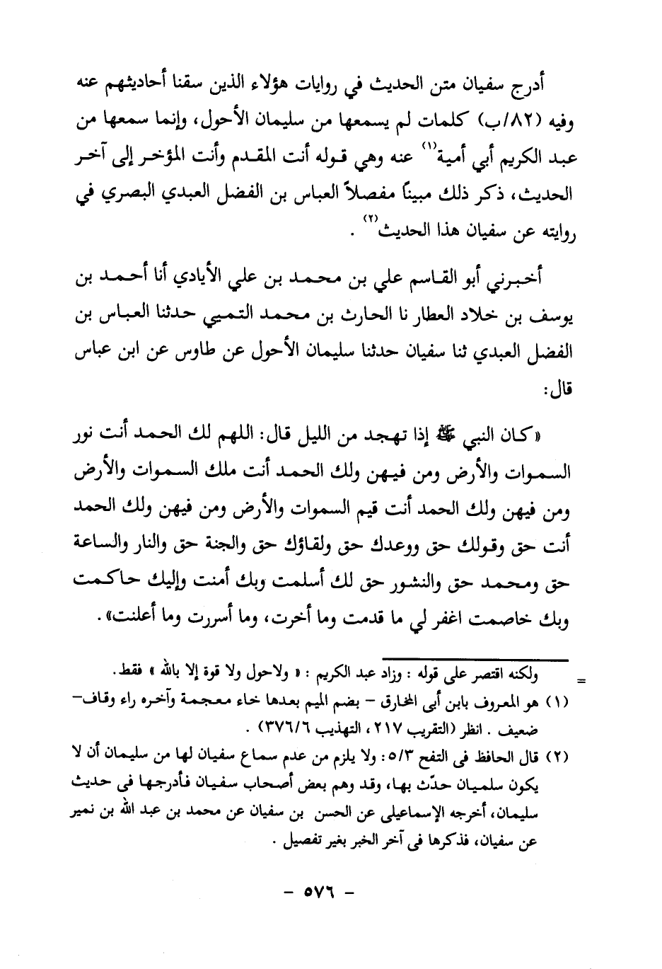 " كَانَ النَّبِيُّ صَلَّى اللَّهُ عَلَيْهِ وَسَلَّمَ إِذَا تَهَجَّدَ مِنَ اللَّيْلِ قَالَ: اللَّهُمَّ لَكَ الْحَمْدُ أَنْتَ نُورُ السَّمَوَاتِ وَالأَرْضِ وَمَنْ فِيهِنَّ وَلَكَ الْحَمْدُ أَنْتَ مَلِكُ السَّمَوَاتِ وَالأَرْضِ وَمَنْ فِيهِنَّ وَلَكَ الْحَمْدُ أَنْتَ قَيِّمُ السَّمَوَاتِ وَالأَرْضِ وَمَنْ فيهن ولك الحمد أنت حق وَقَوْلُكَ حَقٌّ وَوَعْدُكَ حَقٌّ وَلِقَاؤُكَ حَقٌّ وَالْجَنَّةُ حَقٌّ وَالنَّارُ حَقٌّ وَالسَّاعَةُ حَقٌّ وَمُحَمَّدٌ حَقٌّ وَالنُّشُورُ حَقٌّ لَكَ أَسْلَمْتُ وَبِكَ آمَنْتُ وَإِلَيْكَ حَاكَمْتُ وَبِكَ خَاصَمْتُ اغْفِرْ لِي مَا قَدَّمْتُ وَمَا أَخَّرْتُ، وما أسررت وما أعلنت ".