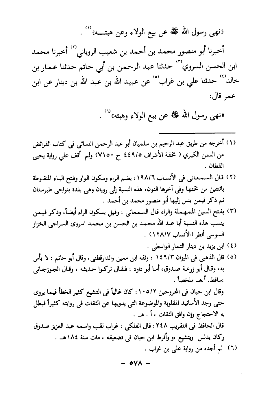 " نَهَى رَسُولُ اللَّهِ صَلَّى اللَّهُ عَلَيْهِ وَسَلَّمَ عَنْ بَيْعِ الْوَلاءِ وهبته " 6.