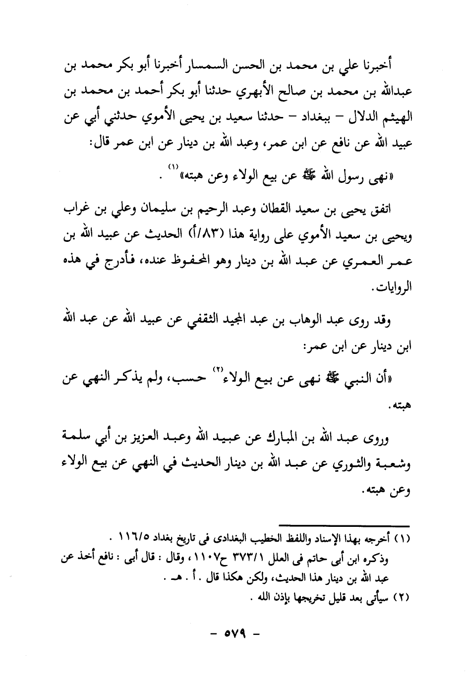 أَخْبَرَنَا عَلِيُّ بْنُ مُحَمَّدِ بْنِ الْحَسَنِ السِّمْسَارُ أَخْبَرَنَا أَبُو بَكْرٍ محمد بن عبد الله بن مُحَمَّدِ بْنِ صَالِحٍ الأَبْهَرِيُّ حَدَّثَنَا أَبُو بَكْرٍ أَحْمَدُ بْنُ مُحَمَّدِ بْنِ الْهَيْثَمِ الدَّلالُ – بِبَغْدَادَ – حَدَّثَنَا سَعِيدُ بْنُ يَحْيَى الأُمَوِيُّ حَدَّثَنِي أَبِي عَنْ عُبَيْدِ اللَّهِ عَنْ نَافِعٍ عَنِ ابْنِ عُمَرَ، وَعَبْدِ اللَّهِ بْنِ دِينَارٍ عَنِ ابْنِ عُمَرَ قَالَ: