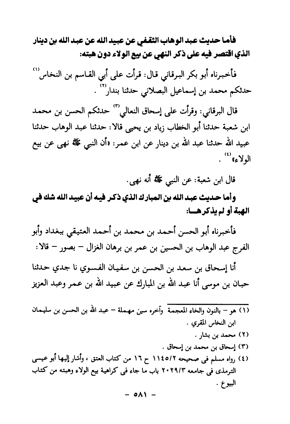 قَالَ الْبَرْقَانِيُّ: وَقَرَأْتُ عَلَى إِسْحَاقَ النِّعَالِيِّ3 حَدَّثَكُمُ الْحَسَنُ بْنُ مُحَمَّدِ بْنِ شُعْبَةَ حَدَّثَنَا أَبُو الْخَطَّابِ زِيَادُ بْنُ يَحْيَى قَالا: حَدَّثَنَا عَبْدُ الْوَهَّابِ حَدَّثَنَا عُبَيْدُ اللَّهِ حَدَّثَنَا عَبْدُ اللَّهِ بْنِ دِينَارٍ عَنِ ابْنِ عُمَرَ: " أَنَّ النَّبِيَّ صَلَّى اللَّهُ عَلَيْهِ وَسَلَّمَ نَهَى عَنْ بَيْعِ الْوَلاءِ " 4.
