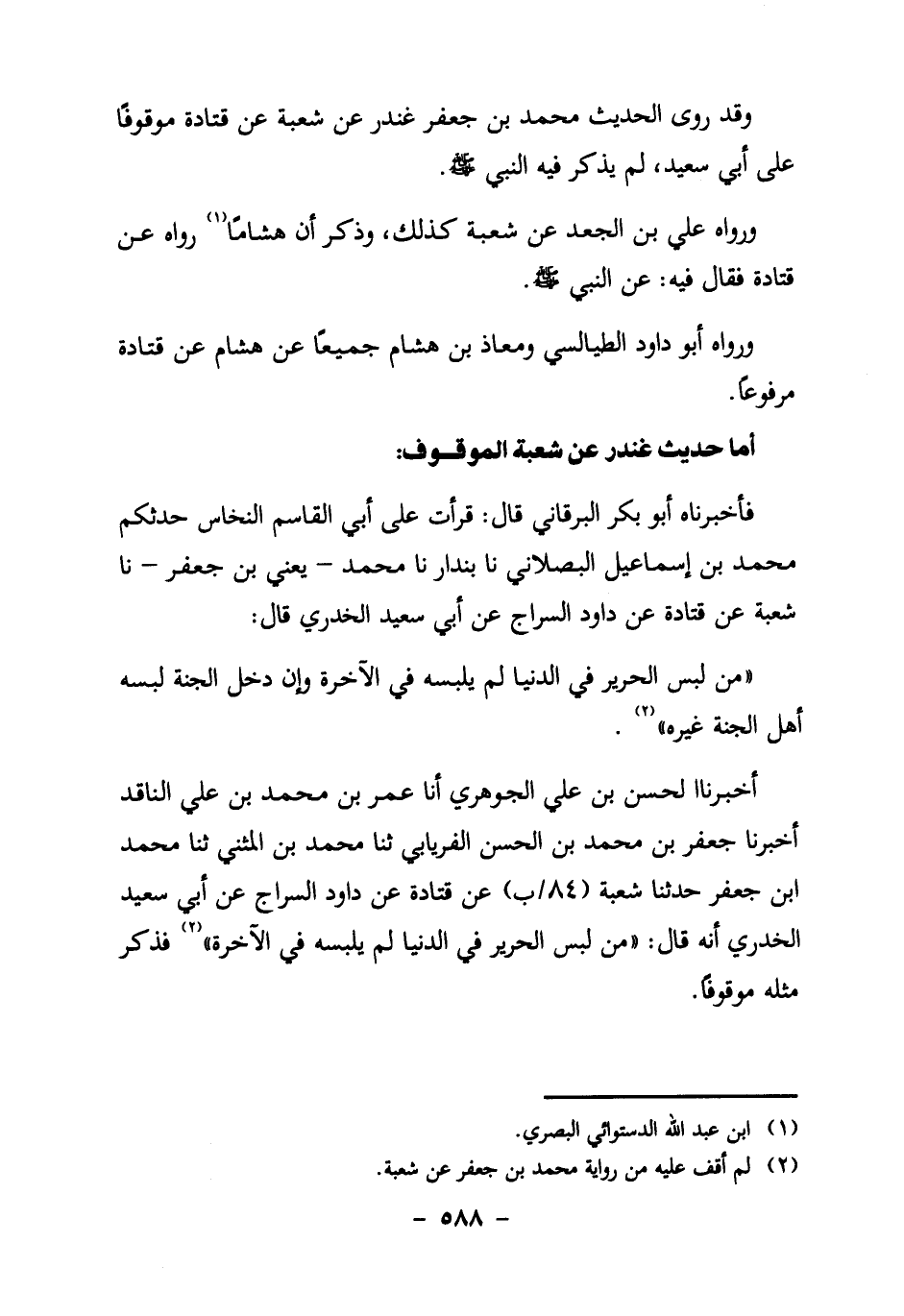 أَخْبَرَنَا الْحَسَنُ بْنُ عَلِيٍّ الْجَوْهَرِيُّ أنا عُمَرُ بْنُ مُحَمَّدِ بْنِ عَلِيٍّ النَّاقِدُ أَخْبَرَنَا جَعْفَرُ بْنُ مُحَمَّدِ بْنِ الْحَسَنِ الْفِرْيَابِيُّ ثَنَا مُحَمَّدُ بْنُ الْمُثَنَّى ثَنَا مُحَمَّدُ بن جعفر حدثنا شعبة (84/ب) عَنْ قَتَادَةَ عَنْ دَاوُدَ السَّرَّاجِ عَنْ أَبِي سَعِيدٍ الْخُدْرِيِّ أَنَّهُ قَالَ: " مَنْ لَبِسَ الْحَرِيرَ فِي الدُّنْيَا لَمْ يَلْبَسْهُ فِي الآخِرَةِ "2 فذكر مثله موقوفا.