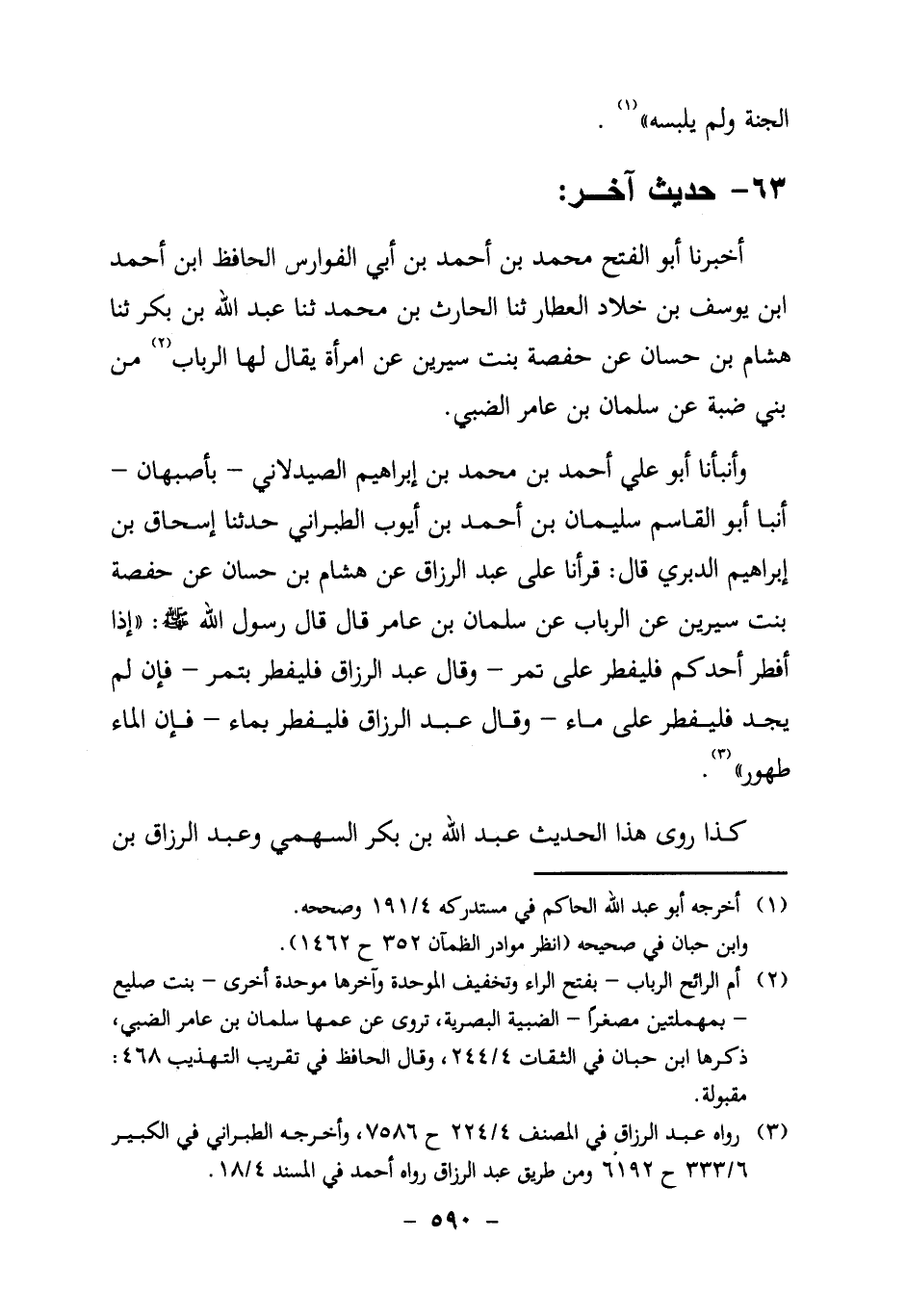 وأنبأنا أَبُو عَلِيٍّ أَحْمَدُ بْنُ مُحَمَّدِ بْنِ إِبْرَاهِيمَ الصَّيْدَلانِيُّ – بِأَصْبَهَانَ – أَنْبَأَ أَبُو الْقَاسِمِ سُلَيْمَانُ بْنُ أَحْمَدَ بْنِ أَيُّوبَ الطَّبَرَانِيُّ حَدَّثَنَا إِسْحَاقُ بْنُ إِبْرَاهِيمَ الدَّبَرِيُّ قَالَ: قَرَأْنَا عَلَى عَبْدِ الرَّزَّاقِ عَنْ هِشَامِ بْنِ حَسَّانٍ عَنْ حَفْصَةَ بِنْتِ سيرين عن الرباب عن سلمان بْنِ عَامِرٍ قَالَ قَالَ رَسُولُ الله صَلَّى اللَّهُ عَلَيْهِ وَسَلَّمَ: " إِذَا أَفْطَرَ أَحَدُكُمْ فَلْيُفْطِرْ عَلَى تَمْرٍ – وَقَالَ عَبْدُ الرَّزَّاقِ: فَلْيُفْطِرْ بِتَمْرٍ – فَإِنْ لَمْ يَجِدْ فَلْيُفْطِرْ عَلَى مَاءٍ – وَقَالَ عَبْدُ الرَّزَّاقِ: فَلْيُفْطِرْ بِمَاءٍ – فَإِنَّ الْمَاءَ طَهُورٌ "3.
