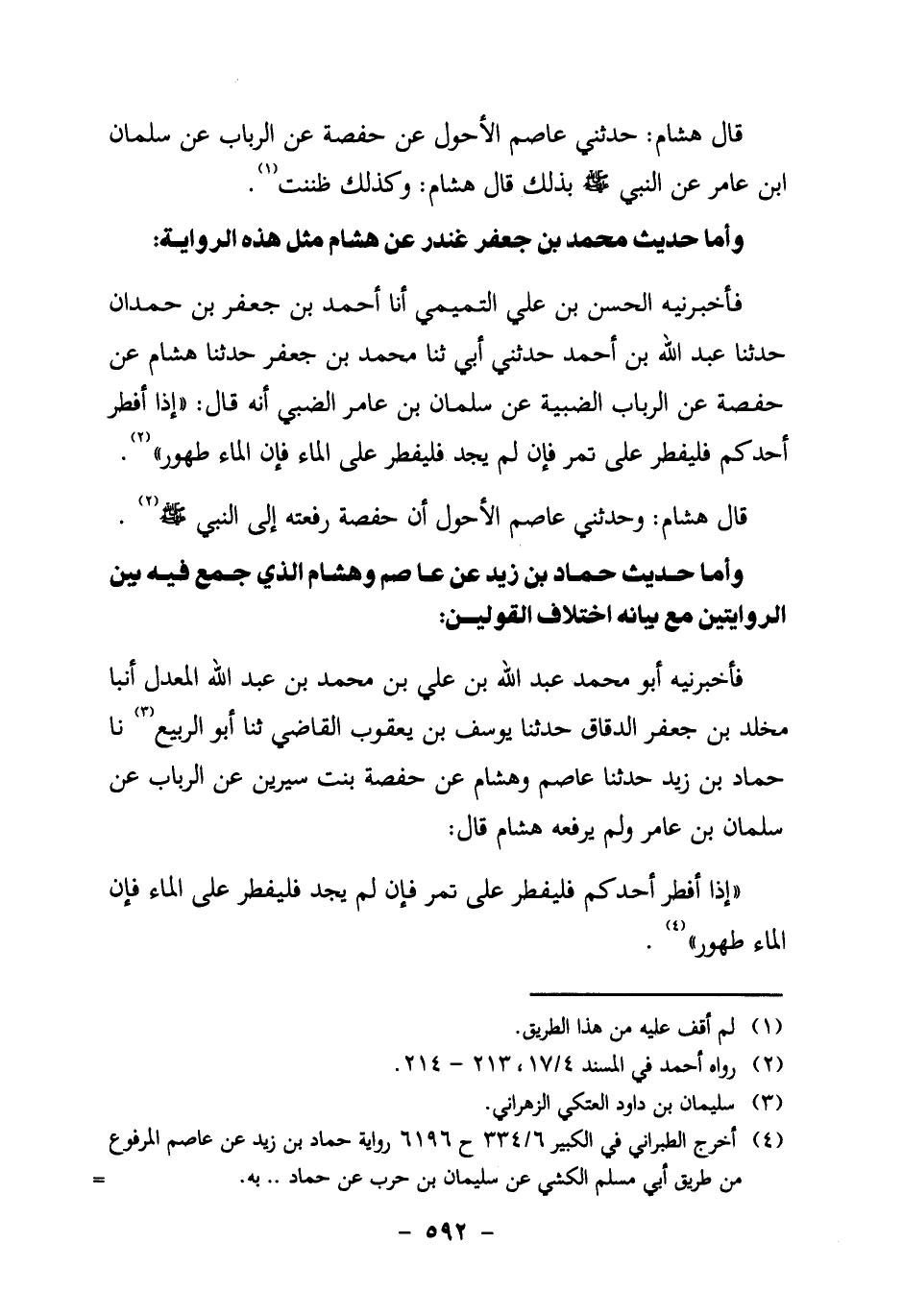 فَأَخْبَرَنِيهِ الْحَسَنُ بْنُ عَلِيٍّ التَّمِيمُي أنا أَحْمَدُ بْنُ جَعْفَرِ بْنِ حمدان حَدَّثَنَا عَبْدُ اللَّهِ بْنُ أَحْمَدَ حَدَّثَنِي أَبِي ثنا مُحَمَّدُ بْنُ جَعْفَرٍ حَدَّثَنَا هِشَامٌ عَنْ حَفْصَةَ عَنِ الرَّبَابِ الضَّبِّيَّةِ عَنْ سَلْمَانَ بْنِ عَامِرٍ الضَّبِّيِّ أَنَّهُ قَالَ: " إِذَا أَفْطَرَ أَحَدُكُمْ فَلْيُفْطِرْ عَلَى تَمْرٍ فَإِنْ لَمْ يَجِدْ فَلْيُفْطِرْ عَلَى الْمَاءِ فَإِنَّ الْمَاءَ طَهُورٌ " 2.