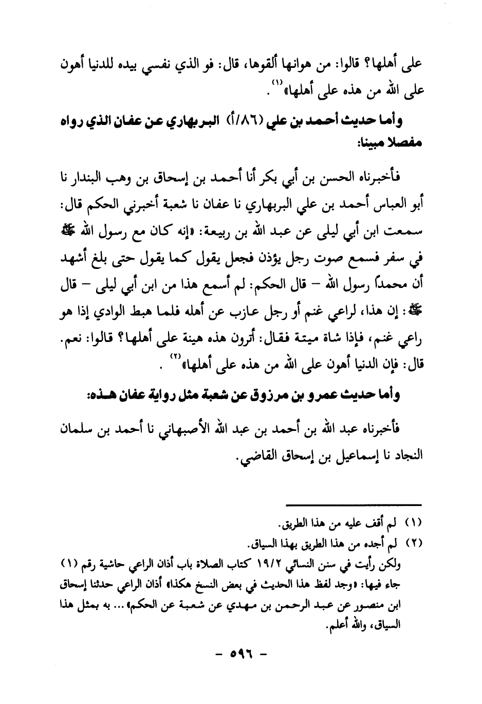 فَأَخْبَرَنَاهُ الْحَسَنُ بْنُ أَبِي بَكْرٍ أنا أَحْمَدُ بْنُ إِسْحَاقَ بْنِ وَهْبٍ الْبُنْدَارُ نا أَبُو الْعَبَّاسِ أَحْمَدُ بْنُ عَلِيٍّ الْبَرْبَهَارِيُّ نا عَفَّانُ نا شُعْبَةُ أَخْبَرَنِي الْحَكَمُ قَالَ: سَمِعْتُ ابْنَ أَبِي لَيْلَى عَنْ عَبْدِ اللَّهِ بْنِ رَبِيعَةَ: " أَنَّهُ كَانَ مَعَ رَسُولِ اللَّهِ صَلَّى اللَّهُ عَلَيْهِ وَسَلَّمَ فِي سَفَرٍ فَسَمِعَ صَوْتَ رَجُلٍ يُؤَذِّنُ فَجَعَلَ يَقُولُ كَمَا يَقُولُ حَتَّى بَلَغَ أَشْهَدُ أَنَّ مُحَمَّدًا رَسُولُ اللَّهِ – قَالَ الْحَكَمُ: لَمْ أَسْمَعْ هَذَا مِنَ ابْنِ أَبِي لَيْلَى – قال صَلَّى اللَّهُ عَلَيْهِ وَسَلَّمَ: أَنْ هذا لراعي غَنَمٍ أَوْ رَجُلٌ عَازِبٌ عَنْ أَهْلِهِ فَلَمَّا هَبَطَ الْوَادِي إِذَا هُوَ رَاعِي غَنَمٍ، فَإِذَا شَاةٌ مَيِّتَةٌ فَقَالَ: أَتَرَوْنَ هَذِهِ هَيِّنَةً عَلَى أَهْلِهَا؟ قَالُوا: نَعَمْ، قَالَ: فَإِنَّ الدُّنْيَا أَهْوَنُ عَلَى اللَّهِ مِنْ هَذِهِ عَلَى أَهْلِهَا " 2.
