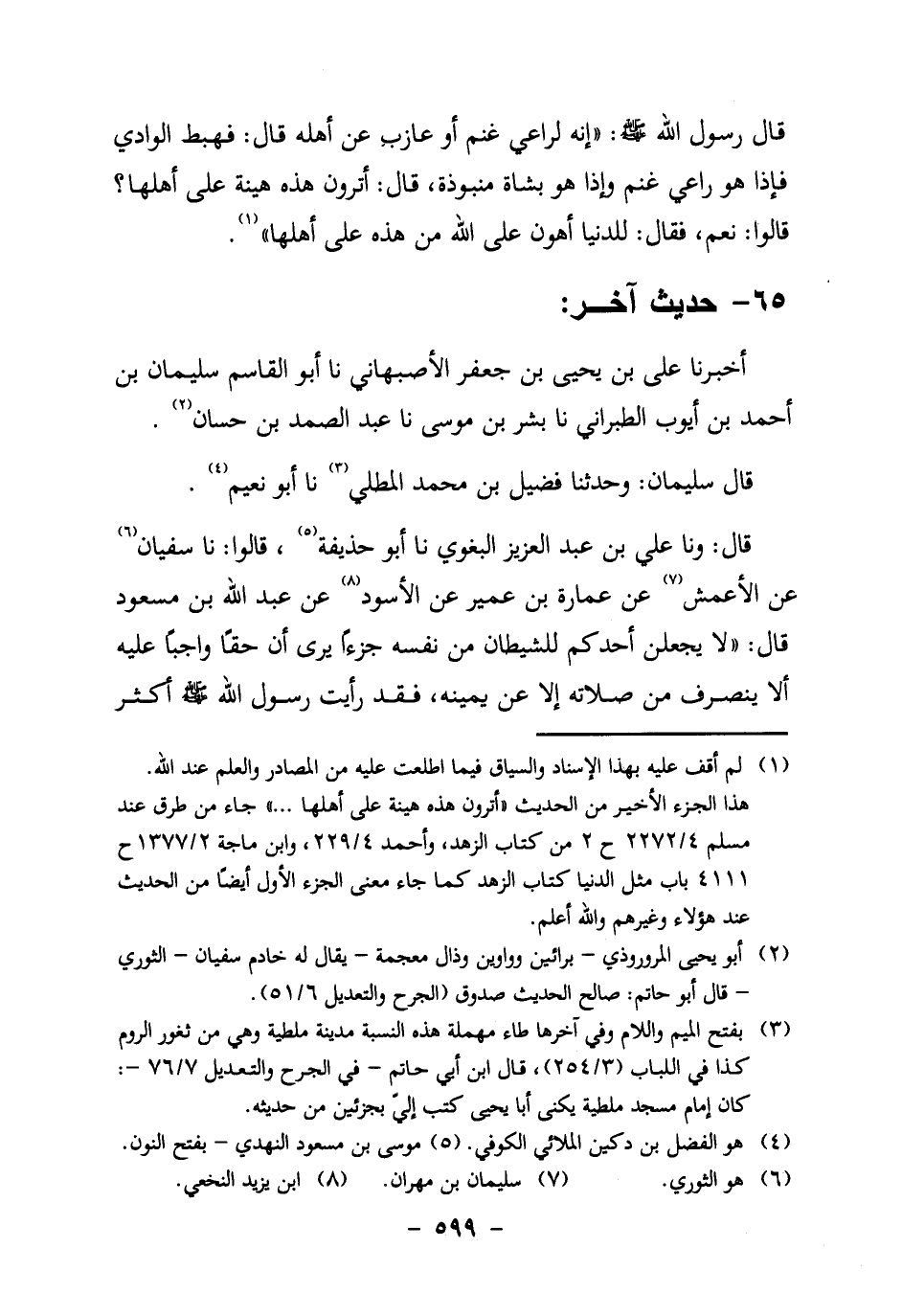 قَالَ: وَنا عَلِيُّ بْنُ عَبْدِ الْعَزِيزِ الْبَغَوِيُّ نا أَبُو حُذَيْفَةَ5، قَالُوا: نا سُفْيَانُ6 عَنِ الأَعْمَشِ7 عَنْ عُمَارَةَ بْنِ عُمَيْرٍ عَنِ الأَسْوَدِ8 عَنْ عبد الله بن مسعود قال: " لا يَجْعَلَنَّ أَحَدُكُمْ لِلشَّيْطَانَ مِنْ نَفْسِهِ جُزْءًا يَرَى أَنَّ حَقًّا وَاجِبًا عَلَيْهِ أَلا يَنْصَرِفَ مِنَ صلاته إِلا عَنْ يَمِينِهِ، فَقَدْ رَأَيْتُ رسول الله صَلَّى اللَّهُ عَلَيْهِ وَسَلَّمَ أكثر