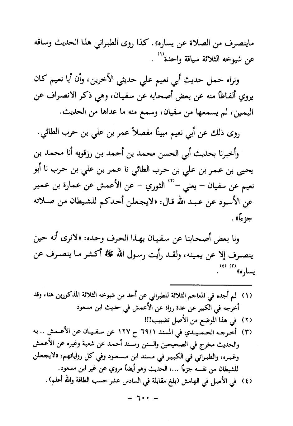 ونا بعض أصحابنا عن سفيان بهذا الحرف وحده: " لا نرى أنه حين ينصرف إلا عن يمينه، ولقد رأيت رسول الله صَلَّى اللَّهُ عَلَيْهِ وَسَلَّمَ أَكْثَرُ ما ينصرف عن يساره " 3 4.