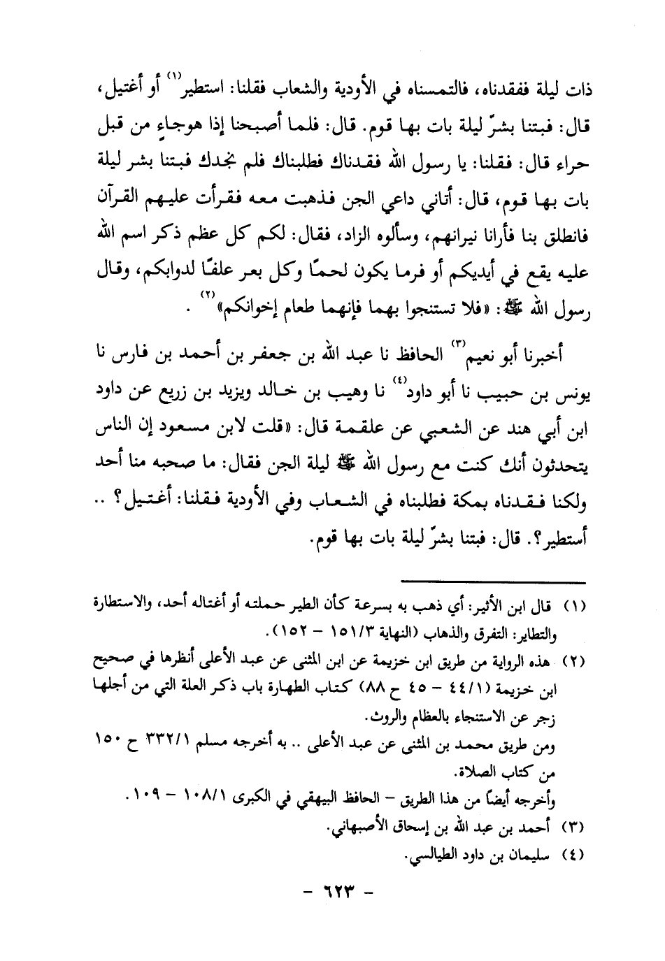 أَخْبَرَنَا أَبُو نُعَيْمٍ3 الْحَافِظُ، نَا عبد الله بن جعفر بن أَحْمَدَ بْنِ فَارِسٍ، نا يُونُسُ بْنُ حَبِيبٍ، نا أَبُو دَاوُدَ4، نا وُهَيْبُ بْنُ خَالِدٍ، وَيَزِيدُ بْنُ زُرَيْعٍ، عَنْ دَاوُدَ بْنِ أَبِي هِنْدٍ، عَنِ الشَّعْبِيِّ، عَنْ عَلْقَمَةَ قَالَ: "قُلْتُ لابْنِ مَسْعُودٍ: إِنَّ النَّاسَ يَتَحَدَّثُونَ أَنَّكَ كُنْتَ مَعَ رَسُولِ اللَّهِ صَلَّى اللَّهُ عَلَيْهِ وَسَلَّمَ لَيْلَةَ الْجِنِّ، فَقَالَ: مَا صَحِبَهُ مِنَّا أَحَدٌ، وَلَكِنَّا فَقَدْنَاهُ بِمَكَّةَ، فَطَلَبْنَاهُ فِي الشِّعَابِ وَفِي الأَوْدِيَةِ فَقُلْنَا: اغْتِيلَ؟ ... اسْتُطِيرَ؟ قَالَ: فَبِتْنَا بِشَرِّ لَيْلَةٍ بَاتَ بها قوم.