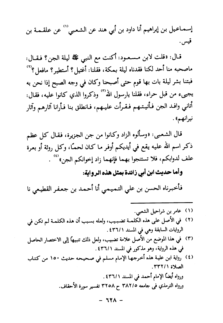 إسماعيل بن إبراهيم، أنا دَاوُدُ بْنُ أَبِي هِنْدٍ، عَنِ الشَّعْبِيِّ1، عَنْ عَلْقَمَةَ بْنِ قَيْسٍ قَالَ: "قُلْتُ لابْنِ مَسْعُودٍ: أَكُنْتَ مَعَ النَّبِيِّ صَلَّى اللَّهُ عَلَيْهِ وَسَلَّمَ لَيْلَةَ الْجِنِّ؟ فَقَالَ: ما صحبه منا أحد، لكنا فَقَدْنَاهُ لَيْلَةً بِمَكَّةَ، فَقُلْنَا: اغْتِيلَ؟ اسْتُطِيرَ؟ مَا فَعَلَ؟ 2 فَبِتْنَا بِشَرِّ لَيْلَةٍ بَاتَ بِهَا قَوْمٌ حَتَّى أَصْبَحْنَا، وَكَانَ فِي وَجْهِ الصُّبْحِ، إِذَا نَحْنُ بِهِ يَجِيءُ مِنْ قِبَلِ حِرَاءَ، فَقُلْنَا: يَا رَسُولَ اللَّهِ3، وَذَكَرُوا الَّذِي كَانُوا عَلَيْهِ، فَقَالَ: أَتَانِي وَافِدُ الْجِنِّ، فَأَتَيْتُهُمْ فقرأت عليهم، فَانْطَلَقَ بِنَا، فَأَرَانَا آثَارَهُمْ وَآثَارَ نِيرَانِهِمْ".