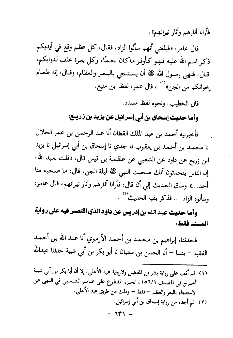 فأخبرناه أَحْمَدُ بْنُ عَبْدِ الْمَلِكِ الْقَطَّانُ، أنا عَبْدُ الرَّحْمَنِ بْنُ عُمَرَ الْخَلَّالُ، نا مُحَمَّدُ بْنُ أَحْمَدَ بْنِ يَعْقُوبَ، نا جَدِّي، نا إِسْحَاقُ بْنُ أَبِي إِسْرَائِيلَ، نا يَزِيدُ بْنُ زُرَيْعٍ، عَنْ دَاوُدَ، عَنِ الشَّعْبِيِّ، عَنْ عَلْقَمَةَ بْنِ قَيْسٍ قَالَ: "قُلْتُ لِعَبْدِ اللَّهِ: إِنَّ النَّاسَ يَتَحَدَّثُونَ أَنَّكَ صَحِبْتَ النبي صَلَّى اللَّهُ عَلَيْهِ وَسَلَّمَ لَيْلَةَ الْجِنِّ، قَالَ: مَا صَحِبَهُ مِنَّا أَحَدٌ ... "، وَسَاقَ الْحَدِيثَ إِلَى أَنْ قَالَ: فَأَرَانَا آثَارَهُمْ وَآثَارَ نِيرَانِهِمْ، قَالَ عَامِرٌ: وَسَأَلُوهُ الزَّادَ ... فَذَكَرَ بَقِيَّةَ الْحَدِيثِ2.