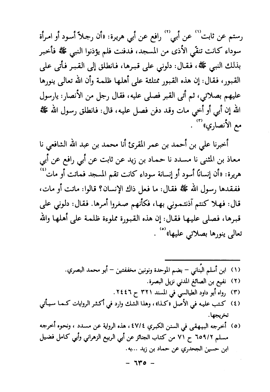 أَخْبَرَنَا عَلِيُّ بْنُ أَحْمَدَ بْنِ عُمَرَ الْمُقْرِئُ، أنا مُحَمَّدُ بْنُ عَبْدِ اللَّهِ الشَّافِعِيُّ، نا مُعَاذُ بْنُ الْمُثَنَّى، نا مُسَدَّدٌ، نا حماد بن زيد عن ثابت، عَنْ أَبِي رَافِعٍ، عَنْ أَبِي هُرَيْرَةَ: "أَنَّ إِنْسَانًا أَسْوَدَ أَوْ إِنْسَانَةً سَوْدَاءَ كَانَتْ تَقُمُّ الْمَسْجِدَ، فَمَاتَتْ أَوْ مَاتَ4، فَفَقَدَهَا رَسُولُ الله صَلَّى اللَّهُ عَلَيْهِ وَسَلَّمَ فَقَالَ: مَا فَعَلَ ذَاكَ الإِنْسَانُ؟ قَالُوا: مَاتَتْ أَوْ مَاتَ، قَالَ: فَهَلا كُنْتُمْ آذَنْتُمُونِي بِهَا، فَكَأَنَّهُمْ صَغَّرُوا أَمْرَهَا، فَقَالَ: دُلُّونِي عَلَى قَبْرِهَا، فَصَلَّى عَلَيْهَا، فَقَالَ: إِنَّ هَذِهِ الْقُبُورَ مَمْلُوءَةٌ ظُلْمَةً عَلَى أَهْلِهَا، وَاللَّهُ تَعَالَى يُنَوِّرُهَا بِصَلاتِي عليها" 5.