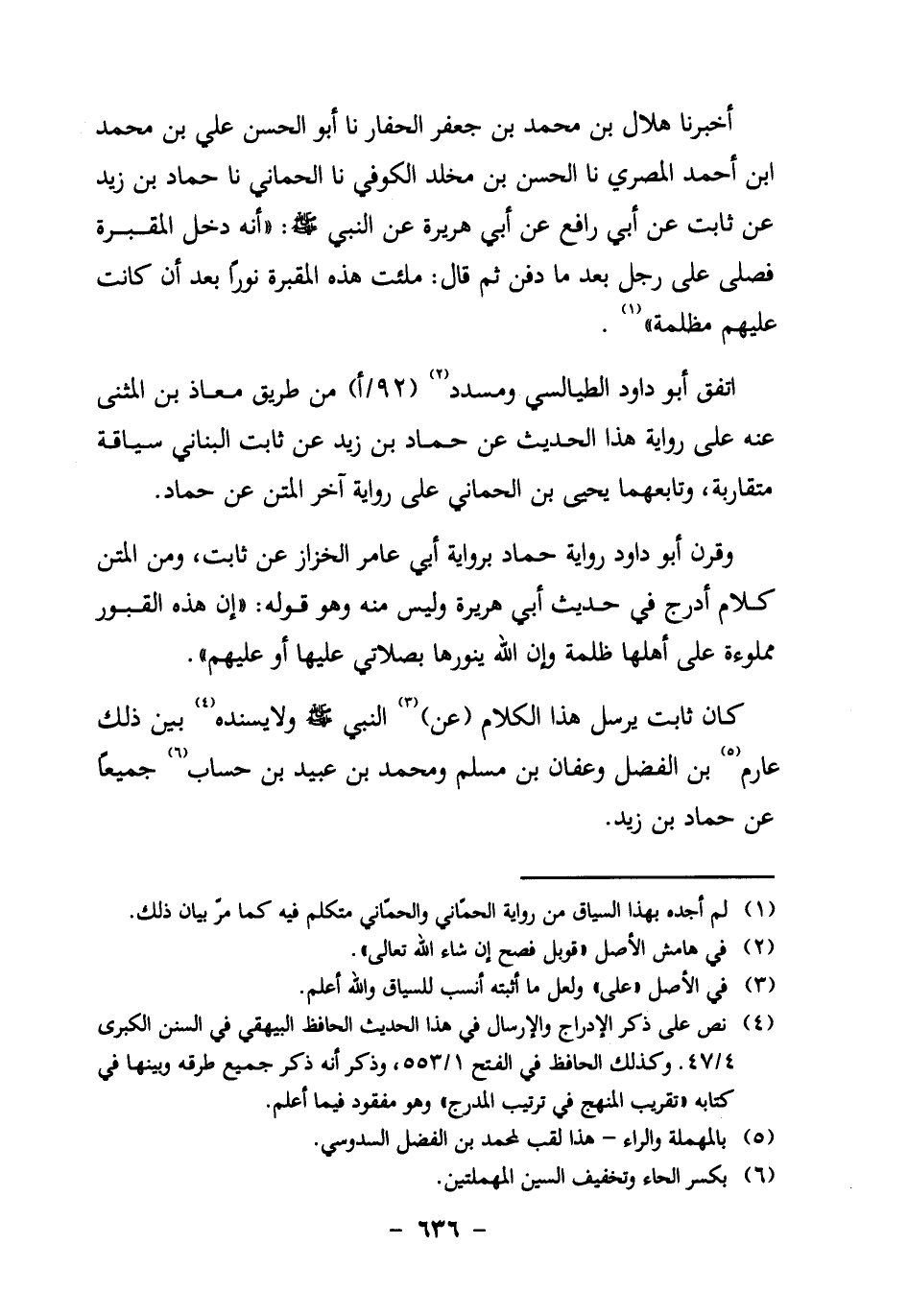 أخبرنا هِلالُ بْنُ مُحَمَّدِ بْنِ جَعْفَرٍ الْحَفَّارُ، نا أَبُو الْحَسَنِ عَلِيُّ بْنُ مُحَمَّدِ بْنِ أَحْمَدَ الْمِصْرِيُّ، نا الْحَسَنُ بْنُ مَخْلَدٍ الْكُوفِيُّ، نا الْحِمَّانِيُّ، نا حَمَّادُ بْنُ زَيْدٍ عَنْ ثَابِتٍ، عَنْ أَبِي رَافِعٍ، عَنْ أَبِي هُرَيْرَةَ، عَنِ النبي صَلَّى اللَّهُ عَلَيْهِ وَسَلَّمَ: "أَنَّهُ دَخَلَ الْمَقْبَرَةَ فَصَلَّى عَلَى رجل بعد ما دُفِنَ ثُمَّ قَالَ: مُلِئَتْ هَذِهِ الْمَقْبَرَةُ نُورًا بَعْدَ أَنْ كَانَتْ عَلَيْهِمْ مُظْلِمَةً" 1.