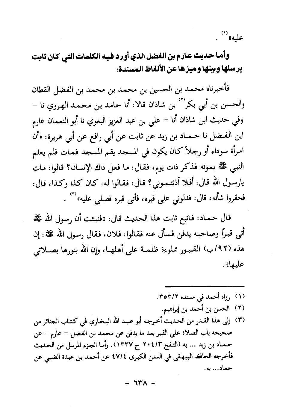 3 إلى هذا القدر من الحديث أخرجه أبو عبد الله البخاري في كتاب الجنائز من صحيحه، باب الصلاة على القبر بعد ما يدفن عن محمد بن الفضل ـ عارم ـ عن حماد بن زيد ... به. الفتح 3/ 204 ح 1337. وأما الجزء المرسل من الحديث فأخرجه الحافظ البيهقي في السنن الكبرى 4/ 47 عن أحمد بن عبدة الضبي، عن حماد ... به.