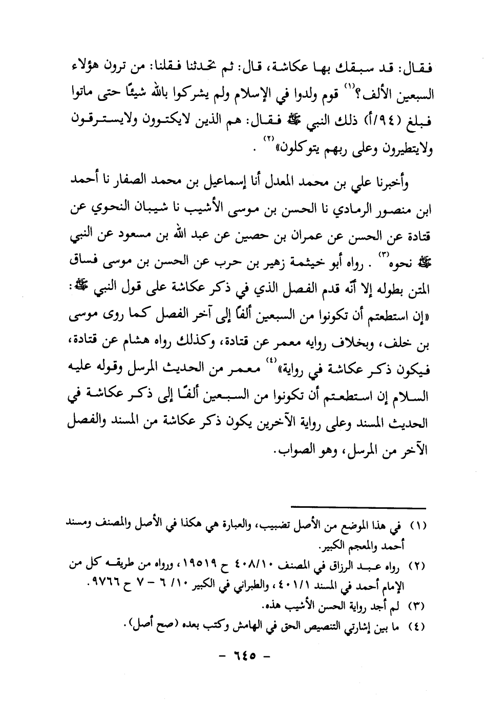 فَقَالَ: قَدْ سَبَقَكَ بِهَا عُكَّاشَةُ، قَالَ: ثُمَّ تَحَدَّثْنَا فَقُلْنَا: مَنْ ترون هؤلاء السبعين ألفاً؟ 1 قوم ولدوا في الإسلام ولم يُشْرِكُوا بِاللَّهِ شَيْئًا حَتَّى مَاتُوا، فبلغ (94/أ) ذَلِكَ النَّبِيَّ صَلَّى اللَّهُ عَلَيْهِ وَسَلَّمَ فَقَالَ: هُمُ الَّذِينَ لا يَكْتَوُونَ، وَلا يَسْتَرِقُونَ، وَلا يَتَطَيَّرُونَ، وعلى ربهم يتوكلون" 2.