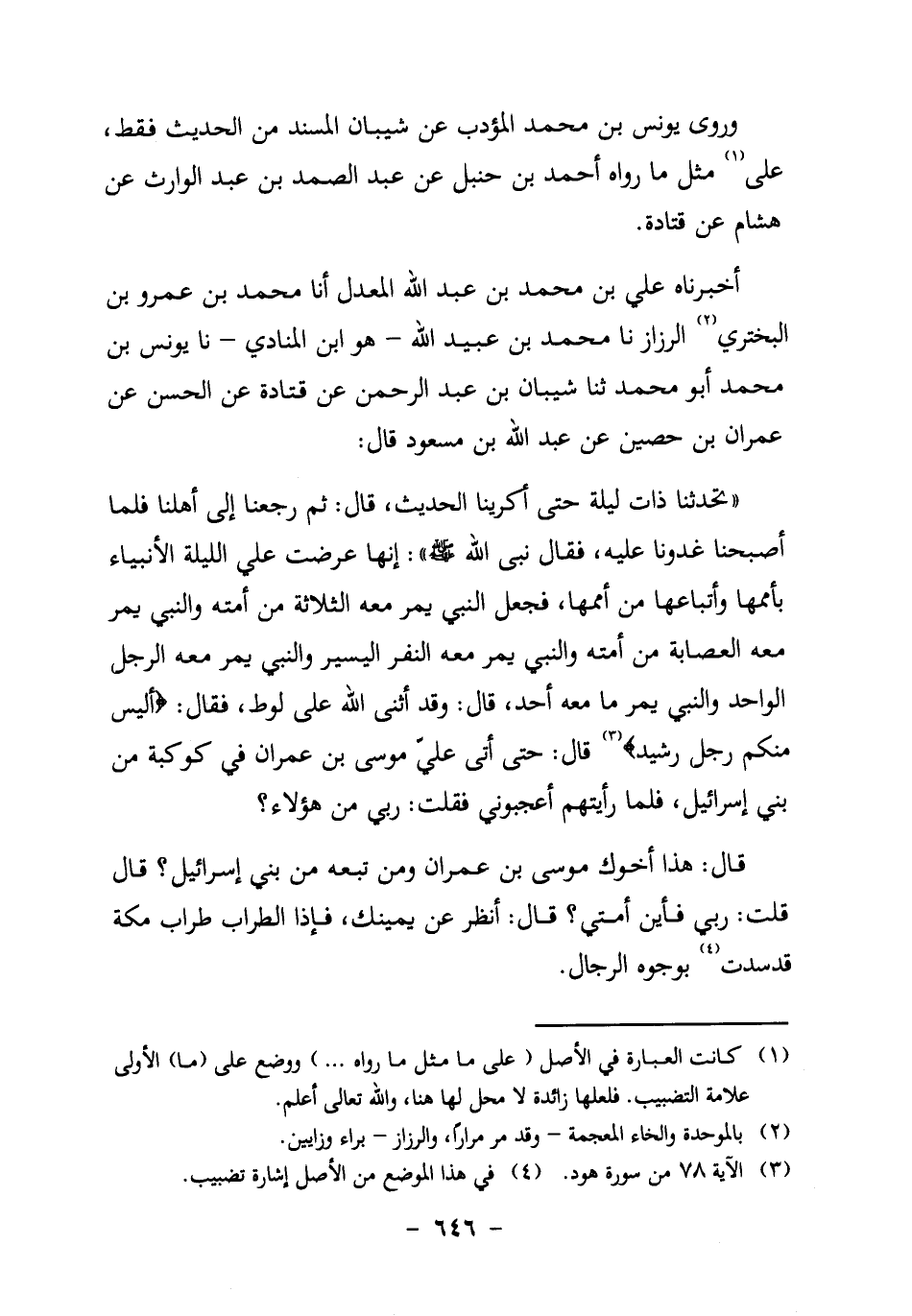 "تَحَدَّثْنَا ذَاتَ لَيْلَةٍ حَتَّى أَكْرَيْنَا الْحَدِيثَ، قَالَ: ثُمَّ رَجَعْنَا إِلَى أَهْلِنَا، فَلَمَّا أَصْبَحْنَا غَدَوْنَا عَلَيْهِ، فَقَالَ نَبِيُّ اللَّهِ صَلَّى اللَّهُ عَلَيْهِ وَسَلَّمَ: أَنَّهَا عُرِضَتْ عَلَيَّ اللَّيْلَةَ الأَنْبِيَاءُ بِأُمَمِهَا وَأَتْبَاعِهَا مِنْ أُمَمِهَا، فَجَعَلَ النَّبِيُّ يَمُرُّ مَعَهُ الثَّلاثَةُ مِنْ أُمَّتِهِ، وَالنَّبِيُّ يَمُرُّ مَعَهُ الْعِصَابَةُ مِنْ أُمَّتِهِ، وَالنَّبِيُّ يَمُرُّ مَعَهُ النَّفَرُ الْيَسِيرُ، وَالنَّبِيُّ يَمُرُّ مَعَهُ الرَّجُلُ الْوَاحِدُ، وَالنَّبِيُّ يَمُرُّ مَا مَعَهُ أَحَدٌ، قَالَ: وَقَدْ أَثْنَى اللَّهُ عَلَى لُوطٍ، فَقَالَ: {أَلَيْسَ مِنْكُمْ رَجُلٌ رَشِيدٌ} 3. قال: حتى أتىعليَّ مُوسَى بْنُ عِمْرَانَ فِي كَوْكَبَةٍ مِنْ بَنِي إِسْرَائِيلَ، فَلَمَّا رَأَيْتُهُمْ أَعْجَبُونِي، فَقُلْتُ: رَبِّي، مَنْ هَؤُلاءِ؟ قَالَ: هَذَا أَخُوكَ مُوسَى بْنُ عِمْرَانَ وَمَنْ تَبِعَهُ مِنْ بَنِي إسرائيل، قُلْتُ: رَبِّي، فَأَيْنَ أُمَّتِي؟ قَالَ: انظر عن يمينك، فإذا الطراب طراب مَكَّةَ قَدْ سُدَّتْ4 بِوُجُوهِ الرِّجَالِ.