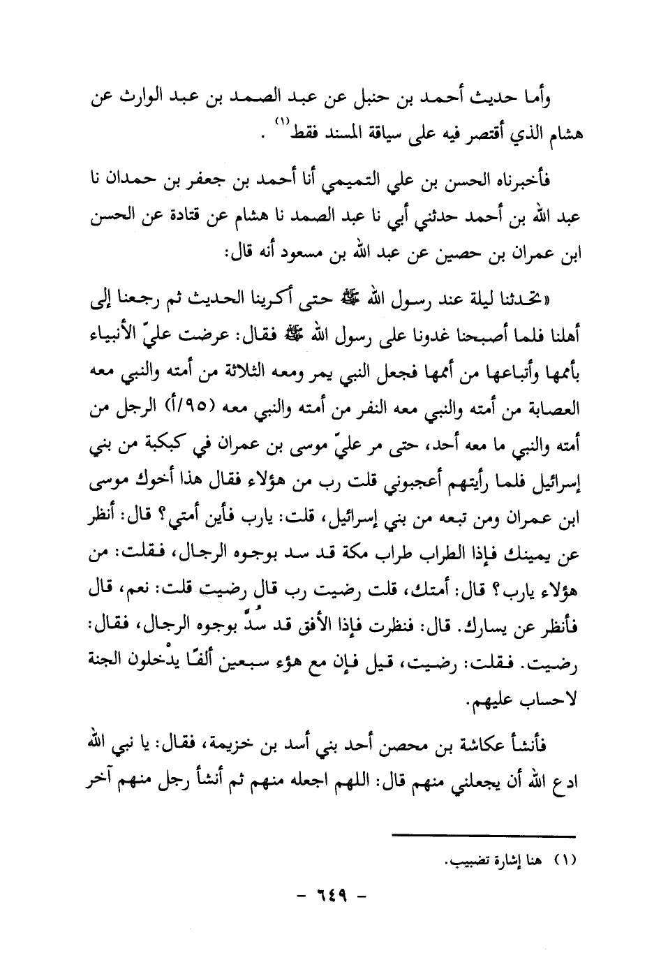 وأما حديث أحمد بن حنبل عن عبد الصمد بن عبد الوارث، عن هشام الذي اقتصر فيه على سياقة المسند فقط1: