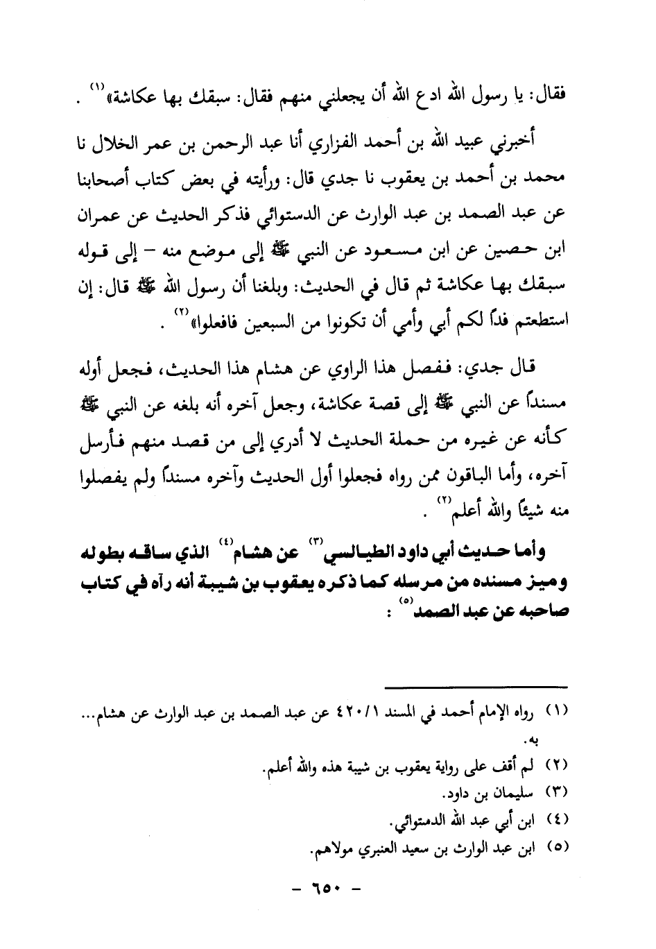 أَخْبَرَنِي عُبَيْدُ اللَّهِ بْنُ أَحْمَدَ الْفَزَارِيُّ، أنا عَبْدُ الرَّحْمَنِ بْنُ عُمَرَ الْخَلَّالُ، نا مُحَمَّدُ بْنُ أَحْمَدَ بْنِ يعقوب، جَدِّي قَالَ: وَرَأَيْتُهُ فِي بَعْضِ كتاب أَصْحَابِنَا عَنْ عَبْدِ الصَّمَدِ بْنِ عَبْدِ الْوَارِثِ، عَنِ الدَّسْتُوَائِيِّ، فَذَكَرَ الْحَدِيثَ عَنْ عِمْرَانَ بْنِ حُصَيْنٍ، عَنِ ابْنِ مَسْعُودٍ، عَنِ النَّبِيِّ صَلَّى اللَّهُ عَلَيْهِ وَسَلَّمَ إِلَى مَوْضِعٍ مِنْهُ ـ إِلَى قَوْلِهِ: "سَبَقَكَ عُكَّاشَةُ"، ثُمَّ قَالَ فِي الْحَدِيثِ: وبلغنا أن رسول الله صَلَّى اللَّهُ عَلَيْهِ وَسَلَّمَ قَالَ: إِنْ استطعتم فداً لَكُمْ أَبِي وَأُمِّي أَنْ تَكُونُوا مِنَ السَّبْعِينَ فَافْعَلُوا" 2.